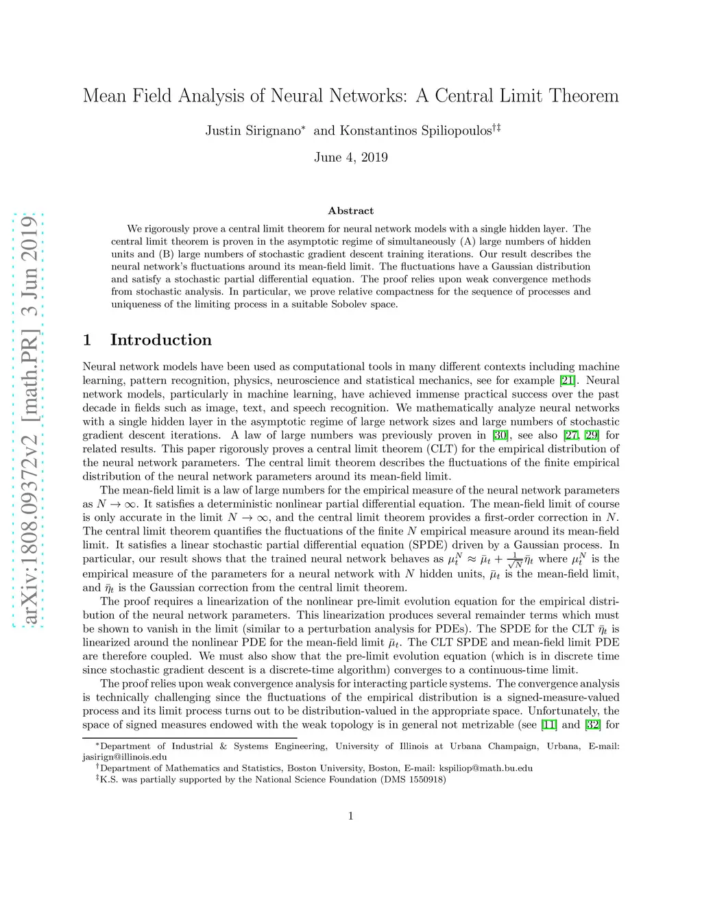 We rigorously prove a central limit theorem for neural network models with a single hidden layer. The central limit theorem is proven in the asymptotic regime of simultaneously (A) large numbers of hidden units and (B) large numbers of stochastic gradient descent training iterations. Our result describes the neural network's fluctuations around its mean-field limit. The fluctuations have a Gaussian distribution and satisfy a stochastic partial differential equation. The proof relies upon weak convergence methods from stochastic analysis. In particular, we prove relative compactness for the sequence of processes and uniqueness of the limiting process in a suitable Sobolev space.