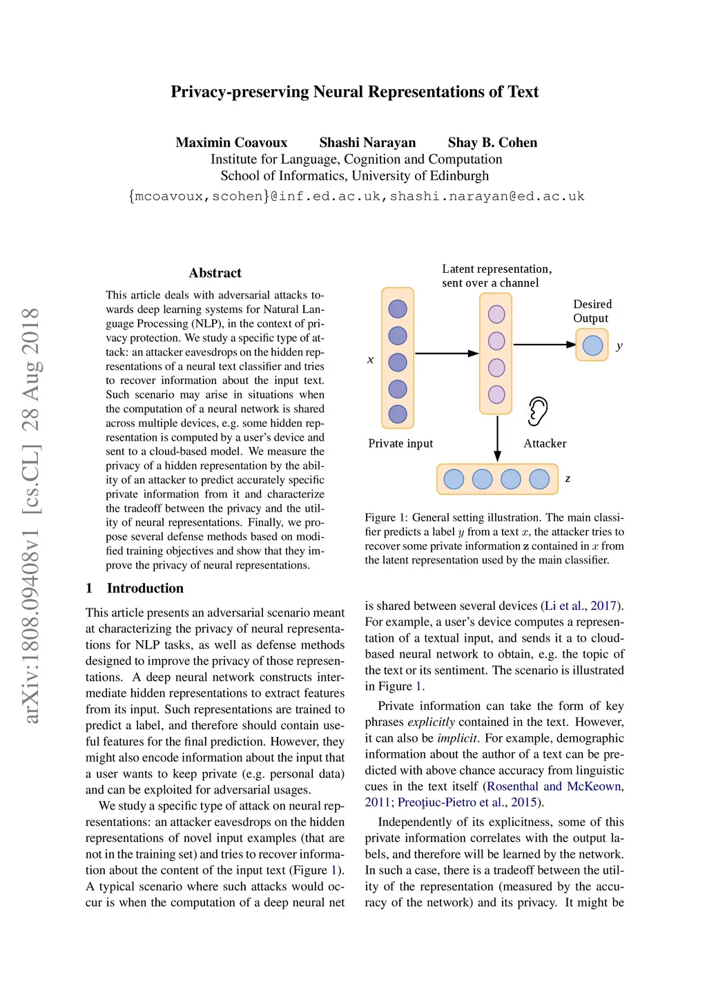This article deals with adversarial attacks towards deep learning systems for Natural Language Processing (NLP), in the context of privacy protection. We study a specific type of attack: an attacker eavesdrops on the hidden representations of a neural text classifier and tries to recover information about the input text. Such scenario may arise in situations when the computation of a neural network is shared across multiple devices, e.g. some hidden representation is computed by a user's device and sent to a cloud-based model. We measure the privacy of a hidden representation by the ability of an attacker to predict accurately specific private information from it and characterize the tradeoff between the privacy and the utility of neural representations. Finally, we propose several defense methods based on modified training objectives and show that they improve the privacy of neural representations.