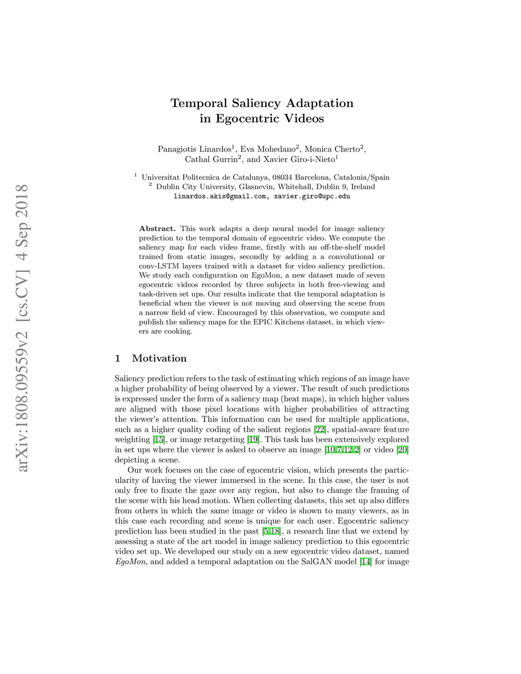 This work adapts a deep neural model for image saliency prediction to the temporal domain of egocentric video. We compute the saliency map for each video frame, firstly with an off-the-shelf model trained from static images, secondly by adding a a convolutional or conv-LSTM layers trained with a dataset for video saliency prediction. We study each configuration on EgoMon, a new dataset made of seven egocentric videos recorded by three subjects in both free-viewing and task-driven set ups. Our results indicate that the temporal adaptation is beneficial when the viewer is not moving and observing the scene from a narrow field of view. Encouraged by this observation, we compute and publish the saliency maps for the EPIC Kitchens dataset, in which viewers are cooking. Source code and models available at https://imatge-upc.github.io/saliency-2018-videosalgan/