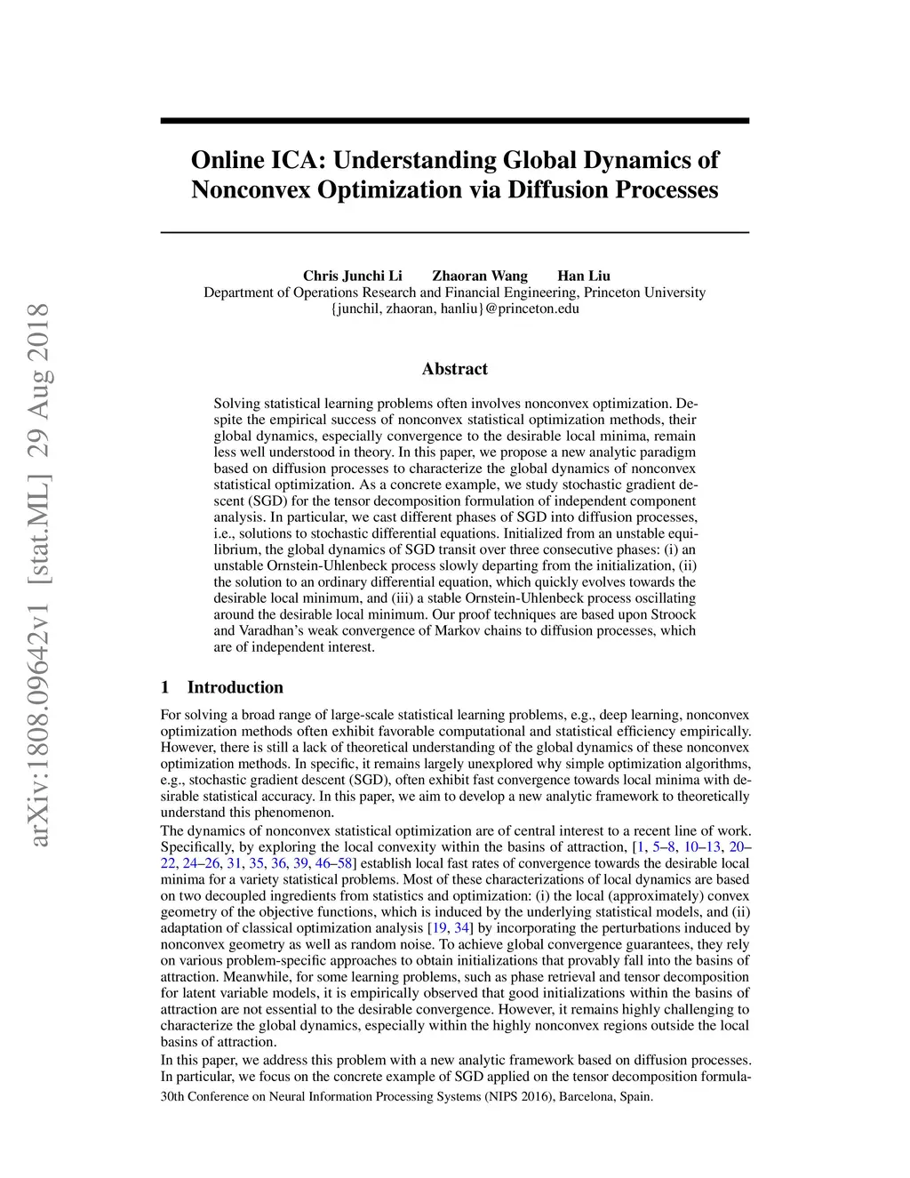Solving statistical learning problems often involves nonconvex optimization. Despite the empirical success of nonconvex statistical optimization methods, their global dynamics, especially convergence to the desirable local minima, remain less well understood in theory. In this paper, we propose a new analytic paradigm based on diffusion processes to characterize the global dynamics of nonconvex statistical optimization. As a concrete example, we study stochastic gradient descent (SGD) for the tensor decomposition formulation of independent component analysis. In particular, we cast different phases of SGD into diffusion processes, i.e., solutions to stochastic differential equations. Initialized from an unstable equilibrium, the global dynamics of SGD transit over three consecutive phases: (i) an unstable Ornstein-Uhlenbeck process slowly departing from the initialization, (ii) the solution to an ordinary differential equation, which quickly evolves towards the desirable local minimum, and (iii) a stable Ornstein-Uhlenbeck process oscillating around the desirable local minimum. Our proof techniques are based upon Stroock and Varadhan's weak convergence of Markov chains to diffusion processes, which are of independent interest.