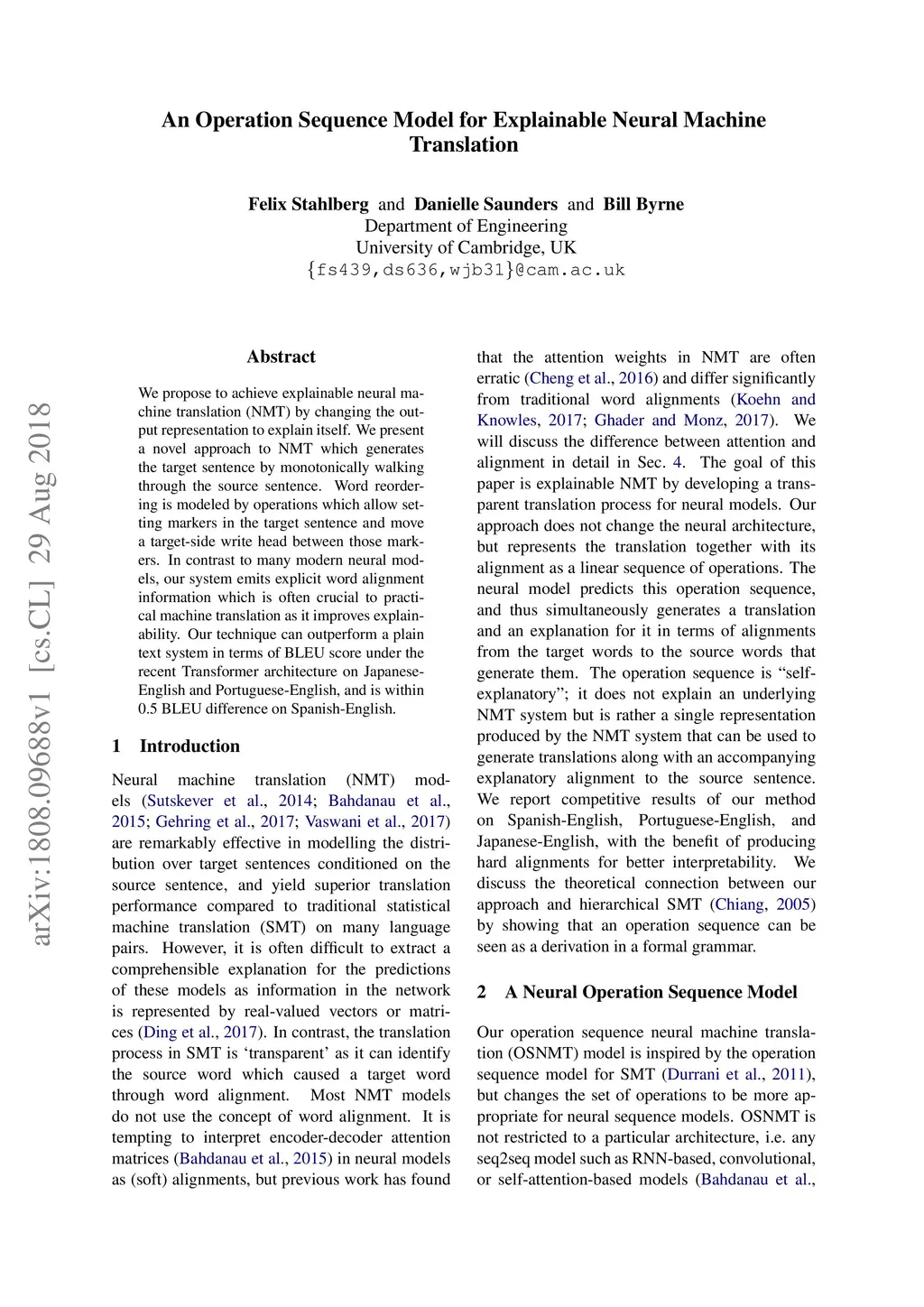 An Operation Sequence Model for Explainable Neural Machine Translation