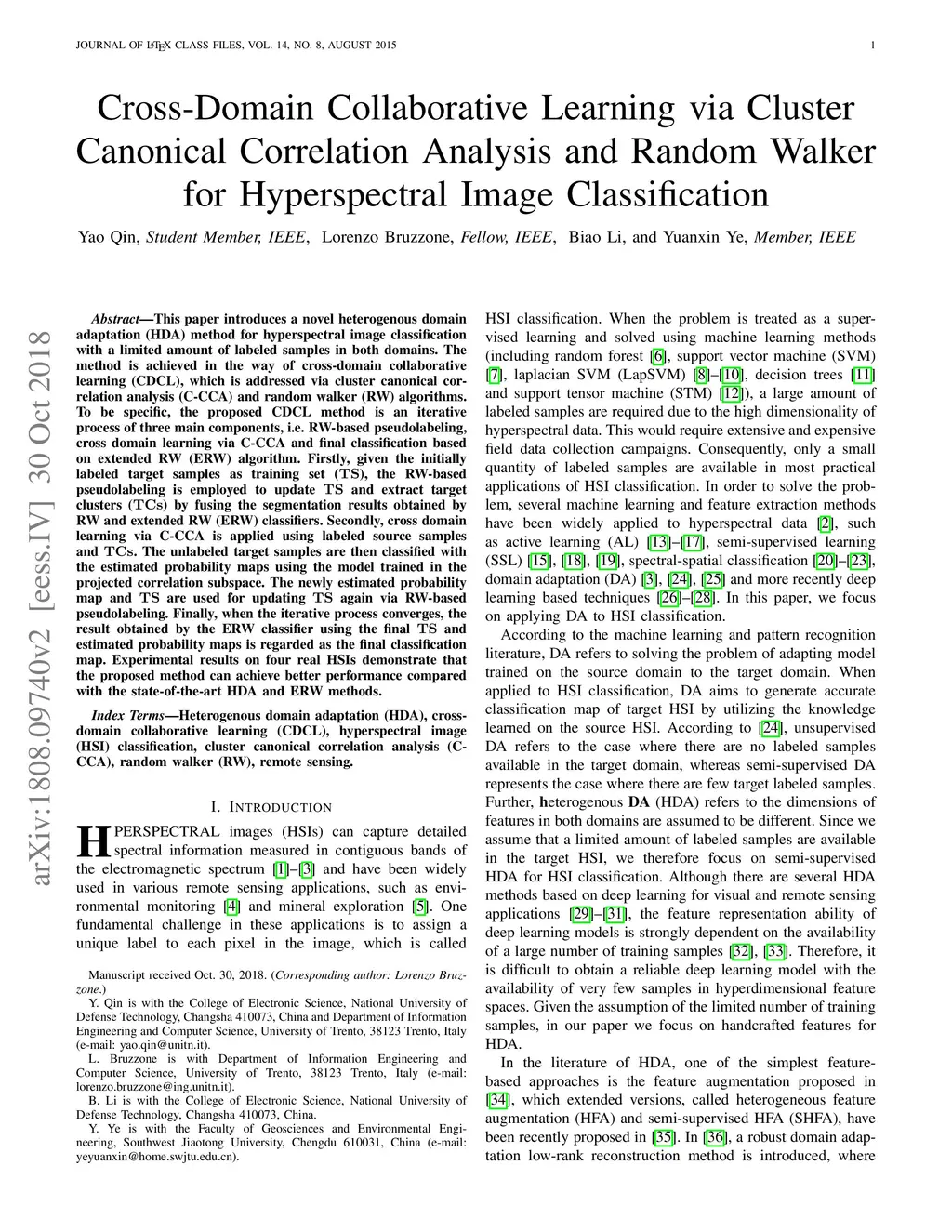 This paper introduces a novel heterogenous domain adaptation (HDA) method for hyperspectral image classification with a limited amount of labeled samples in both domains. The method is achieved in the way of cross-domain collaborative learning (CDCL), which is addressed via cluster canonical correlation analysis (C-CCA) and random walker (RW) algorithms. To be specific, the proposed CDCL method is an iterative process of three main stages, i.e. twice of RW-based pseudolabeling and cross domain learning via C-CCA. Firstly, given the initially labeled target samples as training set (), the RW-based pseudolabeling is employed to update and extract target clusters () by fusing the segmentation results obtained by RW and extended RW (ERW) classifiers. Secondly, cross domain learning via C-CCA is applied using labeled source samples and . The unlabeled target samples are then classified with the estimated probability maps using the model trained in the projected correlation subspace. Thirdly, both and estimated probability maps are used for updating again via RW-based pseudolabeling. When the iterative process finishes, the result obtained by the ERW classifier using the final and estimated probability maps is regarded as the final classification map. Experimental results on four real HSIs demonstrate that the proposed method can achieve better performance compared with the state-of-the-art HDA and ERW methods.