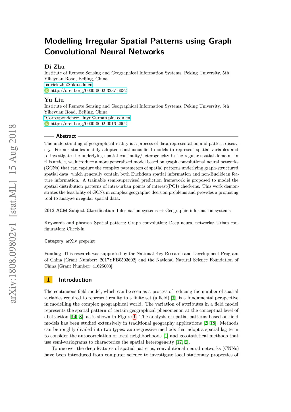 The understanding of geographical reality is a process of data representation and pattern discovery. Former studies mainly adopted continuous-field models to represent spatial variables and to investigate the underlying spatial continuity/heterogeneity in the regular spatial domain. In this article, we introduce a more generalized model based on graph convolutional neural networks (GCNs) that can capture the complex parameters of spatial patterns underlying graph-structured spatial data, which generally contain both Euclidean spatial information and non-Euclidean feature information. A trainable semi-supervised prediction framework is proposed to model the spatial distribution patterns of intra-urban points of interest(POI) check-ins. This work demonstrates the feasibility of GCNs in complex geographic decision problems and provides a promising tool to analyze irregular spatial data.