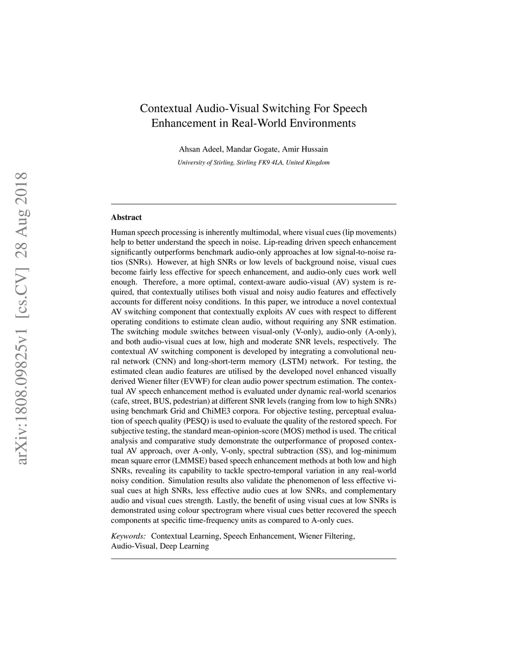 Human speech processing is inherently multimodal, where visual cues (lip movements) help to better understand the speech in noise. Lip-reading driven speech enhancement significantly outperforms benchmark audio-only approaches at low signal-to-noise ratios (SNRs). However, at high SNRs or low levels of background noise, visual cues become fairly less effective for speech enhancement. Therefore, a more optimal, context-aware audio-visual (AV) system is required, that contextually utilises both visual and noisy audio features and effectively accounts for different noisy conditions. In this paper, we introduce a novel contextual AV switching component that contextually exploits AV cues with respect to different operating conditions to estimate clean audio, without requiring any SNR estimation. The switching module switches between visual-only (V-only), audio-only (A-only), and both AV cues at low, high and moderate SNR levels, respectively. The contextual AV switching component is developed by integrating a convolutional neural network and long-short-term memory network. For testing, the estimated clean audio features are utilised by the developed novel enhanced visually derived Wiener filter for clean audio power spectrum estimation. The contextual AV speech enhancement method is evaluated under real-world scenarios using benchmark Grid and ChiME3 corpora. For objective testing, perceptual evaluation of speech quality is used to evaluate the quality of the restored speech. For subjective testing, the standard mean-opinion-score method is used. The critical analysis and comparative study demonstrate the outperformance of proposed contextual AV approach, over A-only, V-only, spectral subtraction, and log-minimum mean square error based speech enhancement methods at both low and high SNRs, revealing its capability to tackle spectro-temporal variation in any real-world noisy condition.