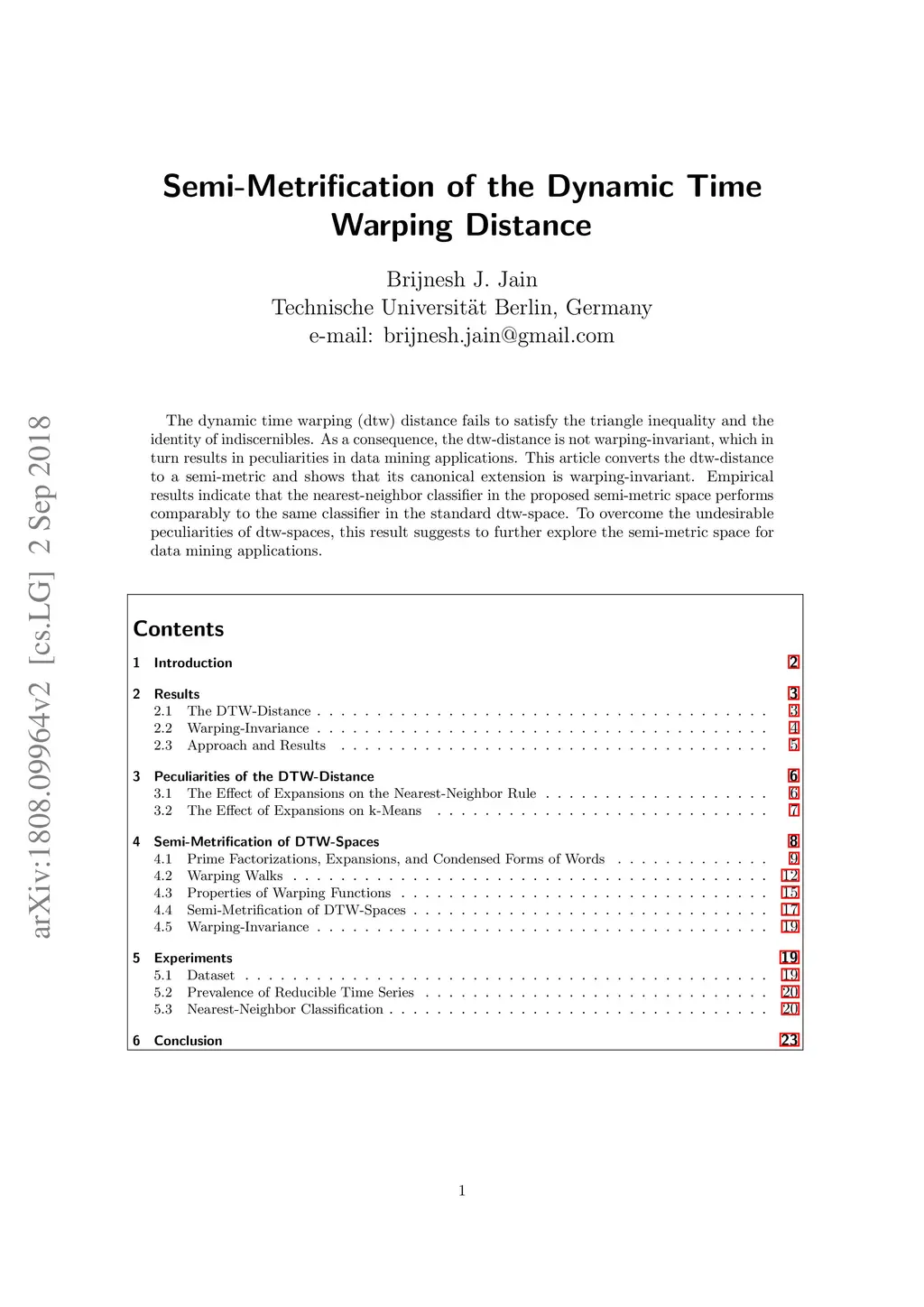 The dynamic time warping (dtw) distance fails to satisfy the triangle inequality and the identity of indiscernibles. As a consequence, the dtw-distance is not warping-invariant, which in turn results in peculiarities in data mining applications. This article converts the dtw-distance to a semi-metric and shows that its canonical extension is warping-invariant. Empirical results indicate that the nearest-neighbor classifier in the proposed semi-metric space performs comparably to the same classifier in the standard dtw-space. To overcome the undesirable peculiarities of dtw-spaces, this result suggests to further explore the semi-metric space for data mining applications.