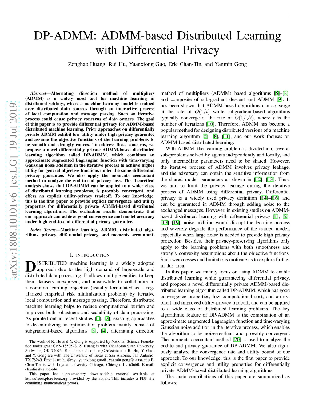 Alternating Direction Method of Multipliers (ADMM) is a widely used tool for machine learning in distributed settings, where a machine learning model is trained over distributed data sources through an interactive process of local computation and message passing. Such an iterative process could cause privacy concerns of data owners. The goal of this paper is to provide differential privacy for ADMM-based distributed machine learning. Prior approaches on differentially private ADMM exhibit low utility under high privacy guarantee and often assume the objective functions of the learning problems to be smooth and strongly convex. To address these concerns, we propose a novel differentially private ADMM-based distributed learning algorithm called DP-ADMM, which combines an approximate augmented Lagrangian function with time-varying Gaussian noise addition in the iterative process to achieve higher utility for general objective functions under the same differential privacy guarantee. We also apply the moments accountant method to bound the end-to-end privacy loss. The theoretical analysis shows that DP-ADMM can be applied to a wider class of distributed learning problems, is provably convergent, and offers an explicit utility-privacy tradeoff. To our knowledge, this is the first paper to provide explicit convergence and utility properties for differentially private ADMM-based distributed learning algorithms. The evaluation results demonstrate that our approach can achieve good convergence and model accuracy under high end-to-end differential privacy guarantee.