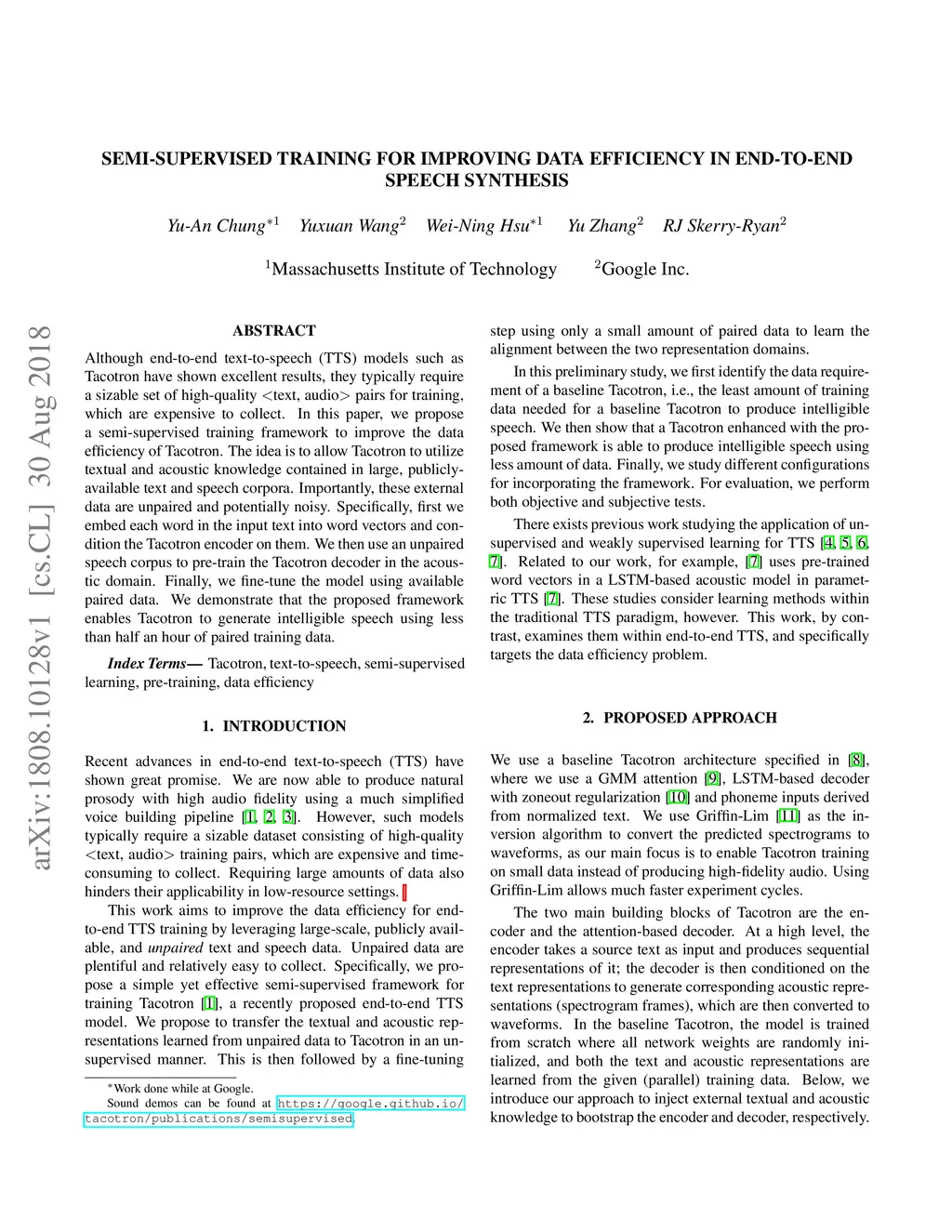 Although end-to-end text-to-speech (TTS) models such as Tacotron have shown excellent results, they typically require a sizable set of high-quality <text, audio> pairs for training, which are expensive to collect. In this paper, we propose a semi-supervised training framework to improve the data efficiency of Tacotron. The idea is to allow Tacotron to utilize textual and acoustic knowledge contained in large, publicly-available text and speech corpora. Importantly, these external data are unpaired and potentially noisy. Specifically, first we embed each word in the input text into word vectors and condition the Tacotron encoder on them. We then use an unpaired speech corpus to pre-train the Tacotron decoder in the acoustic domain. Finally, we fine-tune the model using available paired data. We demonstrate that the proposed framework enables Tacotron to generate intelligible speech using less than half an hour of paired training data.