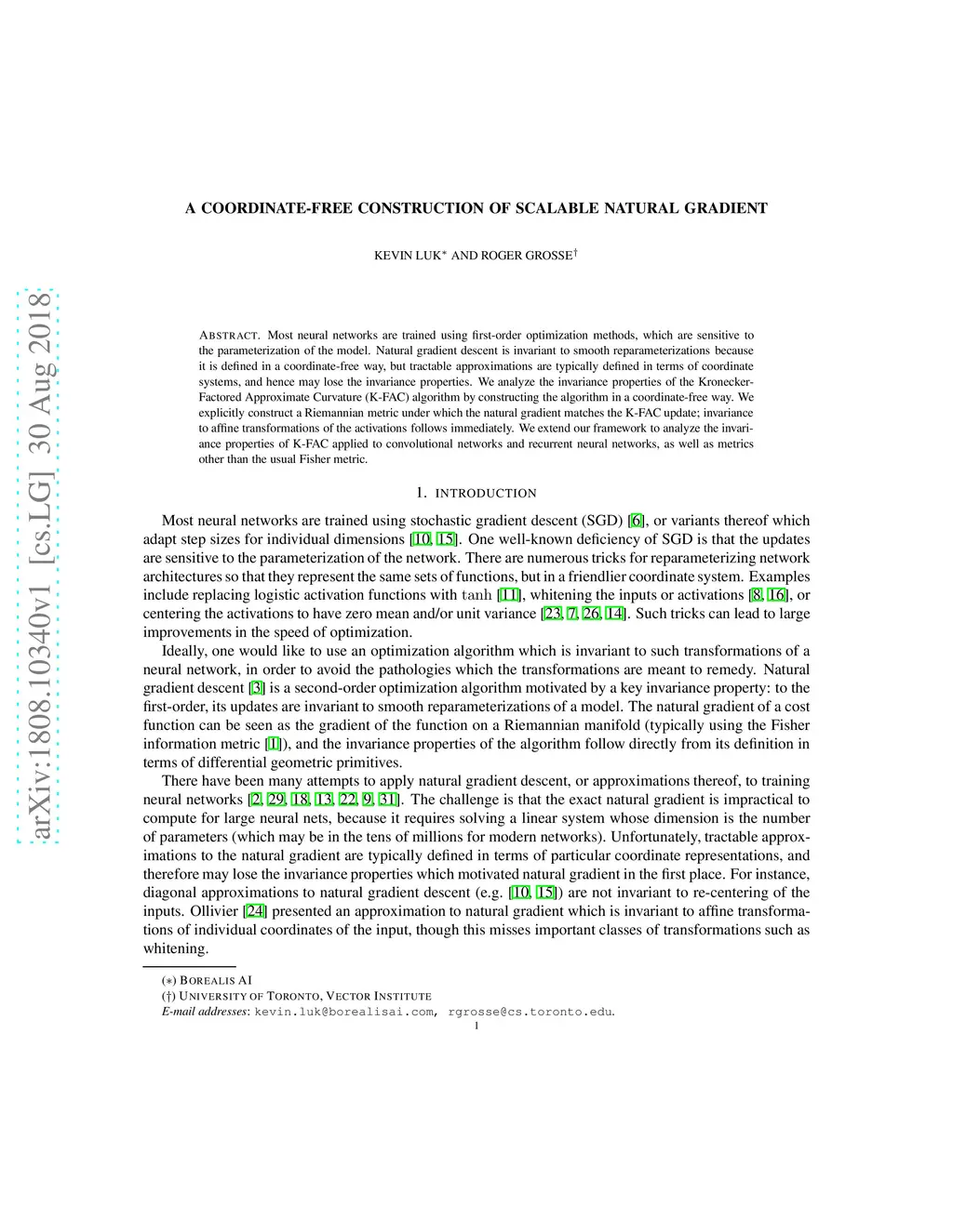 Most neural networks are trained using first-order optimization methods, which are sensitive to the parameterization of the model. Natural gradient descent is invariant to smooth reparameterizations because it is defined in a coordinate-free way, but tractable approximations are typically defined in terms of coordinate systems, and hence may lose the invariance properties. We analyze the invariance properties of the Kronecker-Factored Approximate Curvature (K-FAC) algorithm by constructing the algorithm in a coordinate-free way. We explicitly construct a Riemannian metric under which the natural gradient matches the K-FAC update; invariance to affine transformations of the activations follows immediately. We extend our framework to analyze the invariance properties of K-FAC applied to convolutional networks and recurrent neural networks, as well as metrics other than the usual Fisher metric.