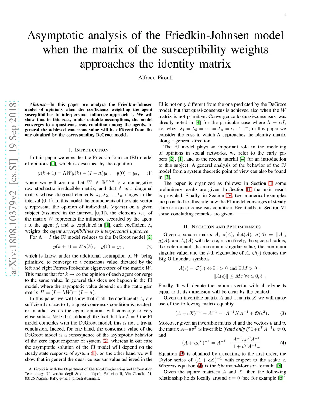 Asymptotic analysis of the Friedkin-Johnsen model when the matrix of the