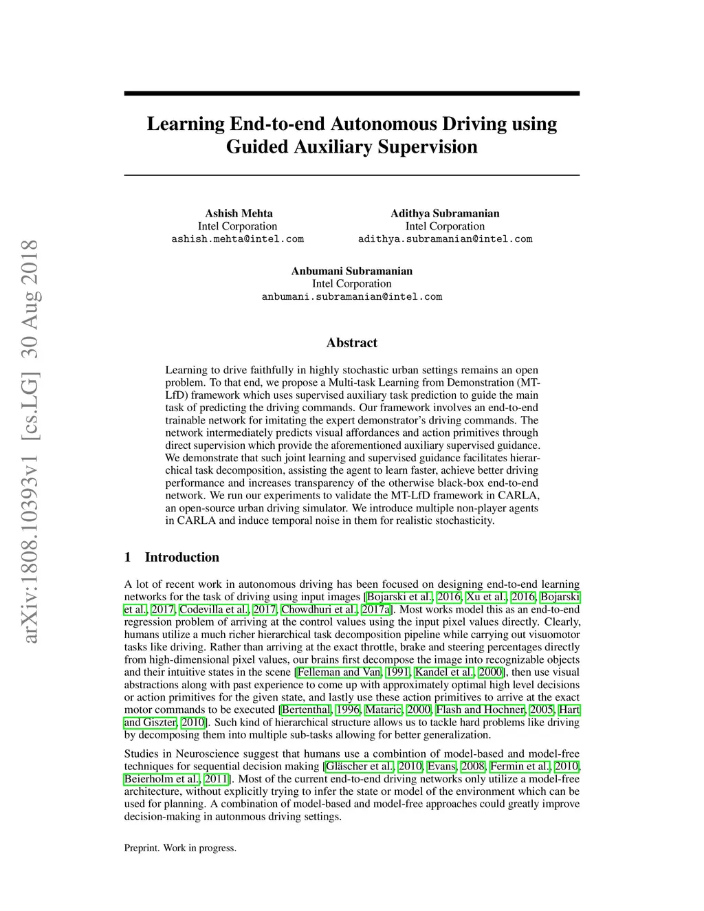 Learning to drive faithfully in highly stochastic urban settings remains an open problem. To that end, we propose a Multi-task Learning from Demonstration (MT-LfD) framework which uses supervised auxiliary task prediction to guide the main task of predicting the driving commands. Our framework involves an end-to-end trainable network for imitating the expert demonstrator's driving commands. The network intermediately predicts visual affordances and action primitives through direct supervision which provide the aforementioned auxiliary supervised guidance. We demonstrate that such joint learning and supervised guidance facilitates hierarchical task decomposition, assisting the agent to learn faster, achieve better driving performance and increases transparency of the otherwise black-box end-to-end network. We run our experiments to validate the MT-LfD framework in CARLA, an open-source urban driving simulator. We introduce multiple non-player agents in CARLA and induce temporal noise in them for realistic stochasticity.
