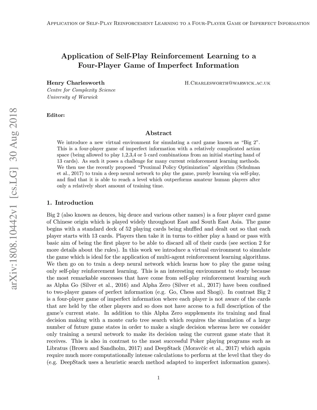 We introduce a new virtual environment for simulating a card game known as "Big 2". This is a four-player game of imperfect information with a relatively complicated action space (being allowed to play 1,2,3,4 or 5 card combinations from an initial starting hand of 13 cards). As such it poses a challenge for many current reinforcement learning methods. We then use the recently proposed "Proximal Policy Optimization" algorithm to train a deep neural network to play the game, purely learning via self-play, and find that it is able to reach a level which outperforms amateur human players after only a relatively short amount of training time and without needing to search a tree of future game states.