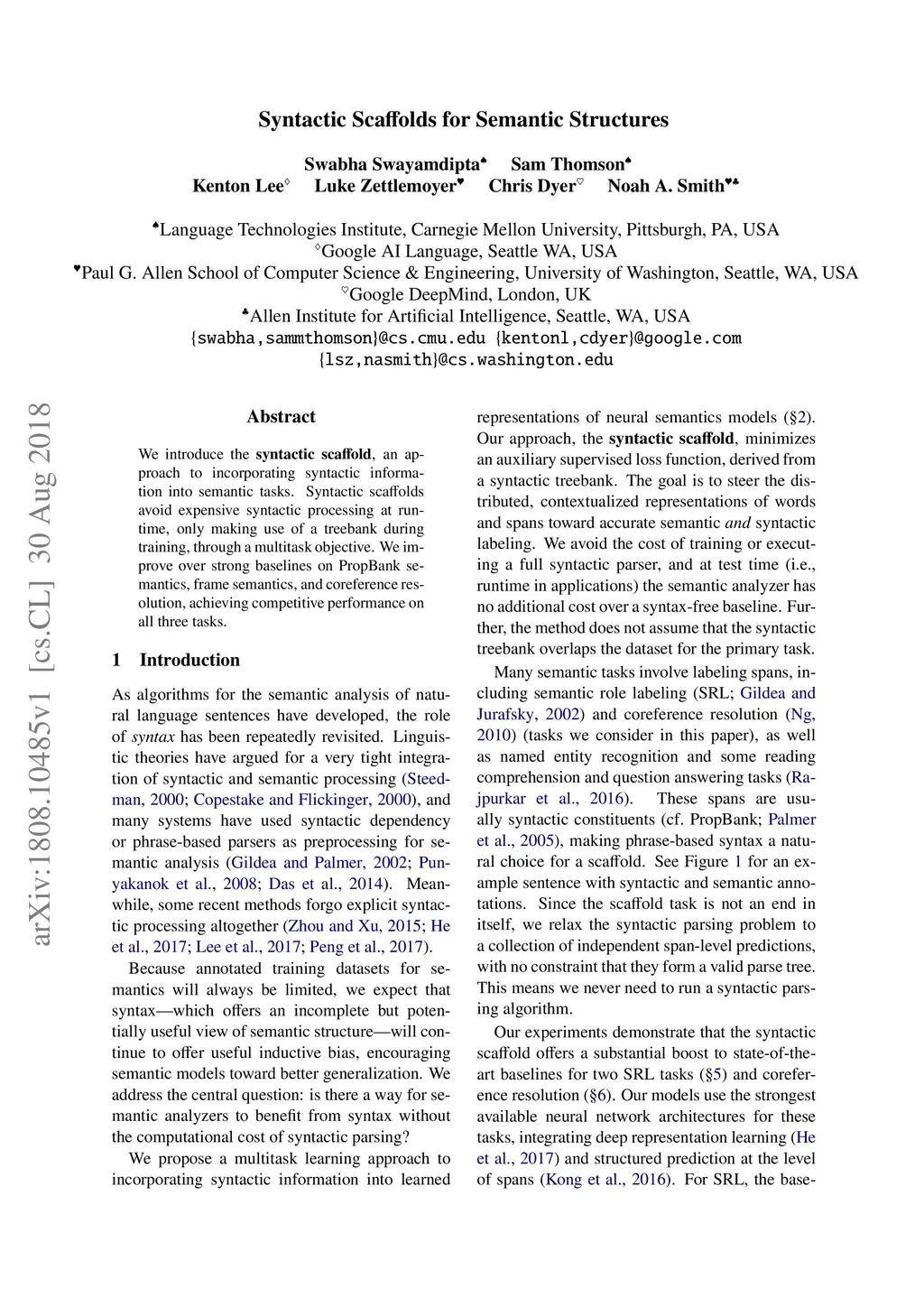 We introduce the syntactic scaffold, an approach to incorporating syntactic information into semantic tasks. Syntactic scaffolds avoid expensive syntactic processing at runtime, only making use of a treebank during training, through a multitask objective. We improve over strong baselines on PropBank semantics, frame semantics, and coreference resolution, achieving competitive performance on all three tasks.
