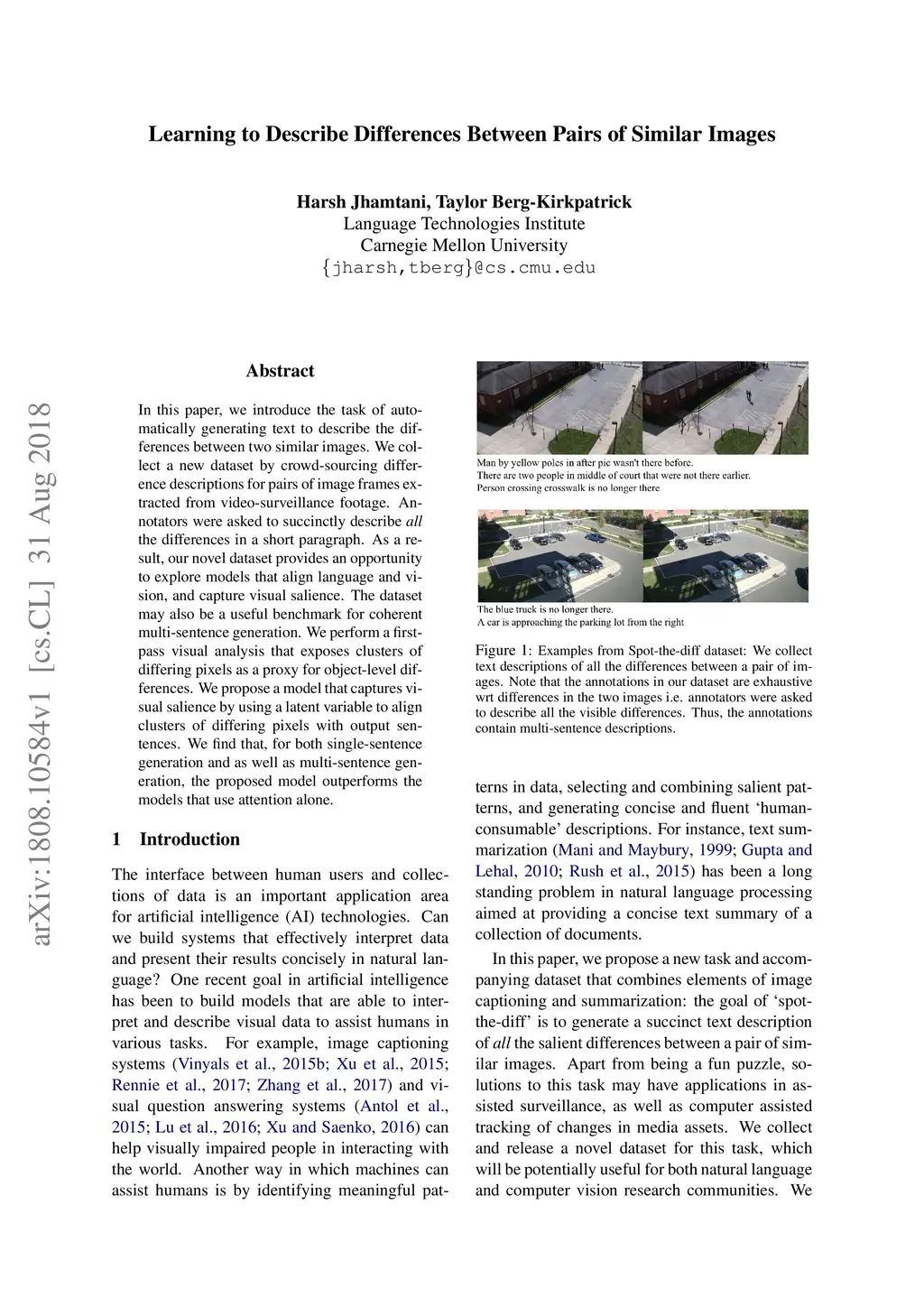 In this paper, we introduce the task of automatically generating text to describe the differences between two similar images. We collect a new dataset by crowd-sourcing difference descriptions for pairs of image frames extracted from video-surveillance footage. Annotators were asked to succinctly describe all the differences in a short paragraph. As a result, our novel dataset provides an opportunity to explore models that align language and vision, and capture visual salience. The dataset may also be a useful benchmark for coherent multi-sentence generation. We perform a firstpass visual analysis that exposes clusters of differing pixels as a proxy for object-level differences. We propose a model that captures visual salience by using a latent variable to align clusters of differing pixels with output sentences. We find that, for both single-sentence generation and as well as multi-sentence generation, the proposed model outperforms the models that use attention alone.