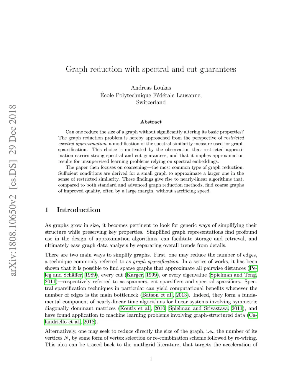 Can one reduce the size of a graph without significantly altering its basic properties? The graph reduction problem is hereby approached from the perspective of restricted spectral approximation, a modification of the spectral similarity measure used for graph sparsification. This choice is motivated by the observation that restricted approximation carries strong spectral and cut guarantees, and that it implies approximation results for unsupervised learning problems relying on spectral embeddings. The paper then focuses on coarsening---the most common type of graph reduction. Sufficient conditions are derived for a small graph to approximate a larger one in the sense of restricted similarity. These findings give rise to nearly-linear algorithms that, compared to both standard and advanced graph reduction methods, find coarse graphs of improved quality, often by a large margin, without sacrificing speed.