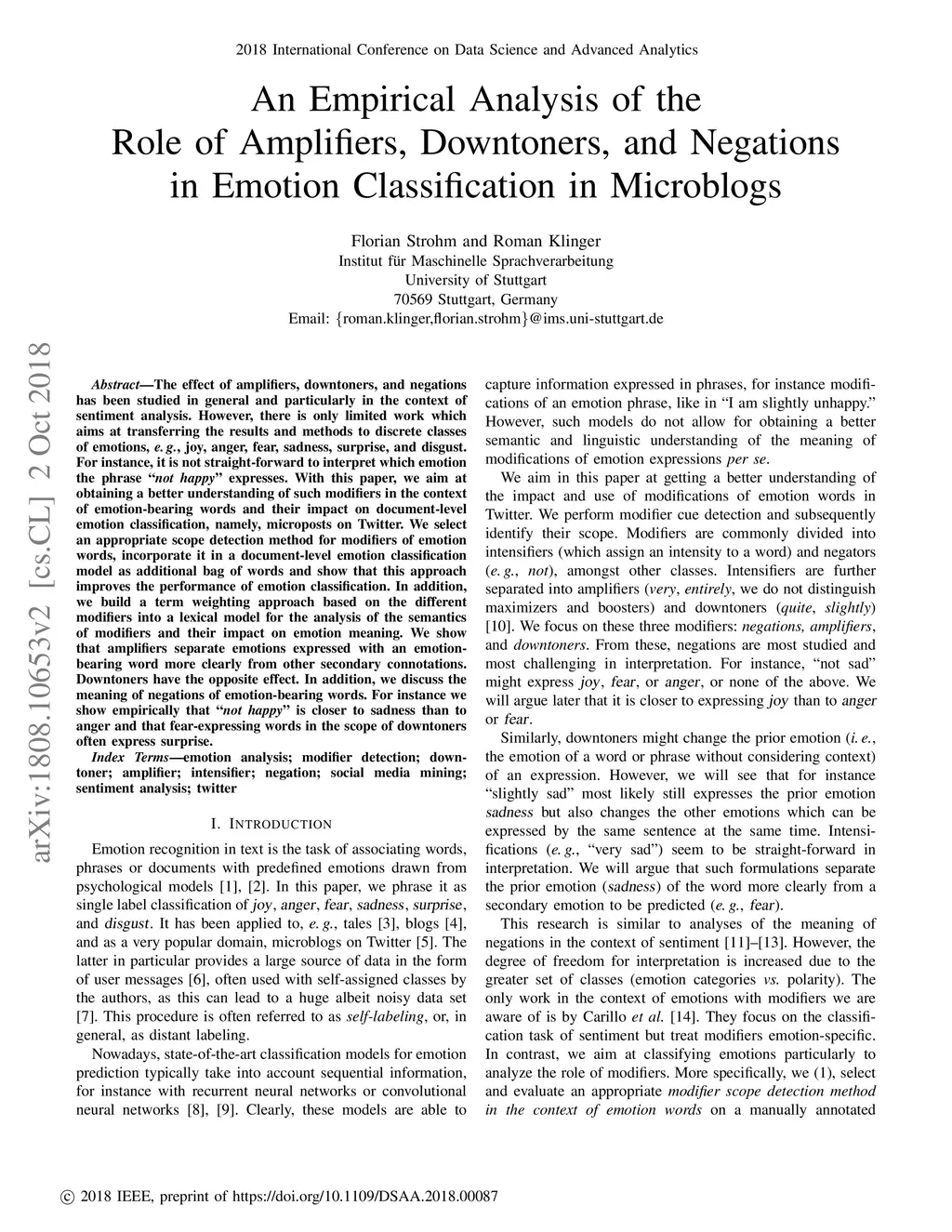 The effect of amplifiers, downtoners, and negations has been studied in general and particularly in the context of sentiment analysis. However, there is only limited work which aims at transferring the results and methods to discrete classes of emotions, e. g., joy, anger, fear, sadness, surprise, and disgust. For instance, it is not straight-forward to interpret which emotion the phrase "not happy" expresses. With this paper, we aim at obtaining a better understanding of such modifiers in the context of emotion-bearing words and their impact on document-level emotion classification, namely, microposts on Twitter. We select an appropriate scope detection method for modifiers of emotion words, incorporate it in a document-level emotion classification model as additional bag of words and show that this approach improves the performance of emotion classification. In addition, we build a term weighting approach based on the different modifiers into a lexical model for the analysis of the semantics of modifiers and their impact on emotion meaning. We show that amplifiers separate emotions expressed with an emotion- bearing word more clearly from other secondary connotations. Downtoners have the opposite effect. In addition, we discuss the meaning of negations of emotion-bearing words. For instance we show empirically that "not happy" is closer to sadness than to anger and that fear-expressing words in the scope of downtoners often express surprise.