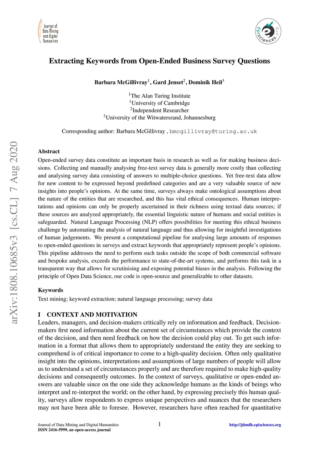 Open-ended survey data constitute an important basis in research as well as for making business decisions. Collecting and manually analysing free-text survey data is generally more costly than collecting and analysing survey data consisting of answers to multiple-choice questions. Yet free-text data allow for new content to be expressed beyond predefined categories and are a very valuable source of new insights into people's opinions. At the same time, surveys always make ontological assumptions about the nature of the entities that are researched, and this has vital ethical consequences. Human interpretations and opinions can only be properly ascertained in their richness using textual data sources; if these sources are analyzed appropriately, the essential linguistic nature of humans and social entities is safeguarded. Natural Language Processing (NLP) offers possibilities for meeting this ethical business challenge by automating the analysis of natural language and thus allowing for insightful investigations of human judgements. We present a computational pipeline for analysing large amounts of responses to open-ended questions in surveys and extract keywords that appropriately represent people's opinions. This pipeline addresses the need to perform such tasks outside the scope of both commercial software and bespoke analysis, exceeds the performance to state-of-the-art systems, and performs this task in a transparent way that allows for scrutinising and exposing potential biases in the analysis. Following the principle of Open Data Science, our code is open-source and generalizable to other datasets.