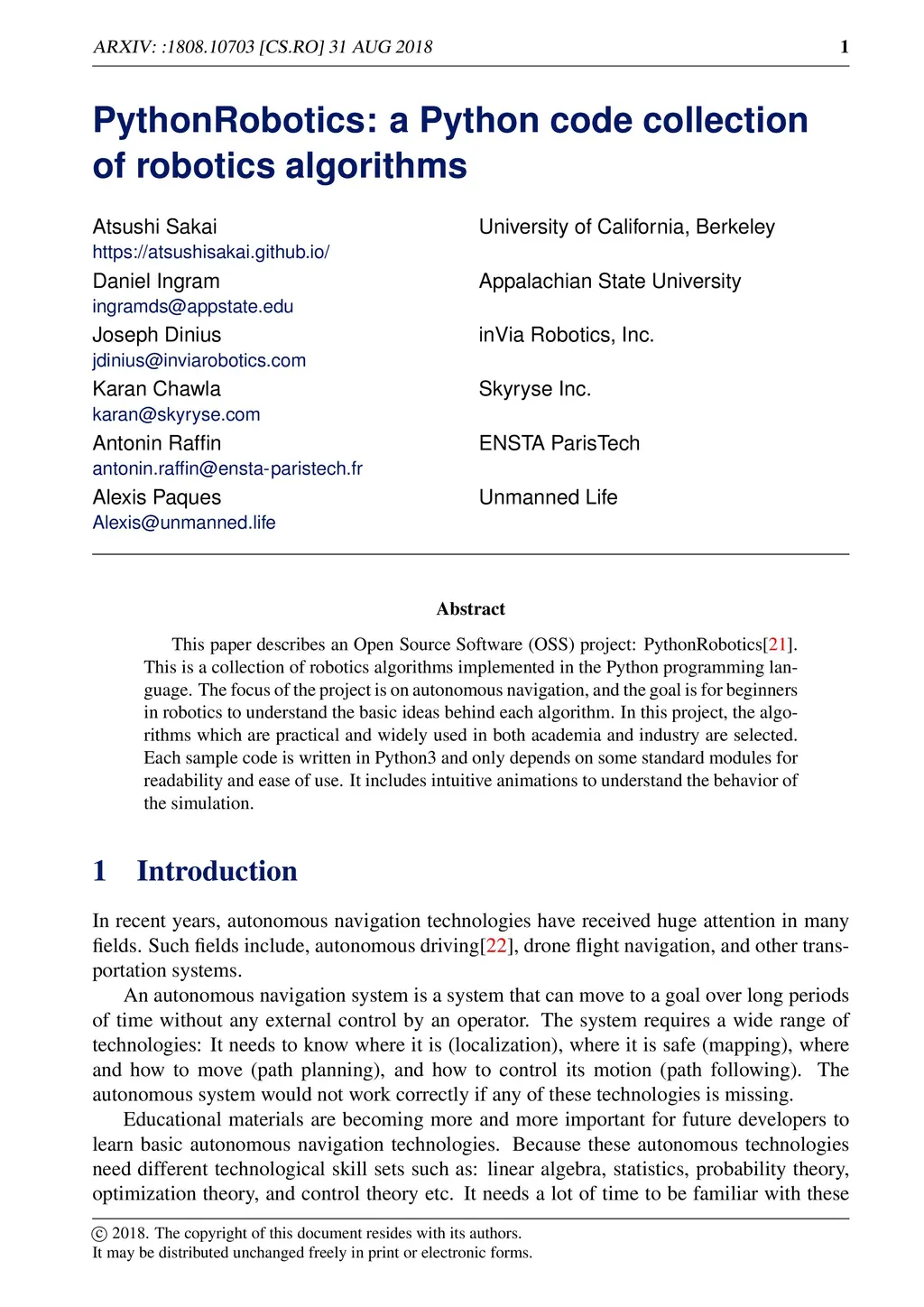 This paper describes an Open Source Software (OSS) project: PythonRobotics. This is a collection of robotics algorithms implemented in the Python programming language. The focus of the project is on autonomous navigation, and the goal is for beginners in robotics to understand the basic ideas behind each algorithm. In this project, the algorithms which are practical and widely used in both academia and industry are selected. Each sample code is written in Python3 and only depends on some standard modules for readability and ease of use. It includes intuitive animations to understand the behavior of the simulation.