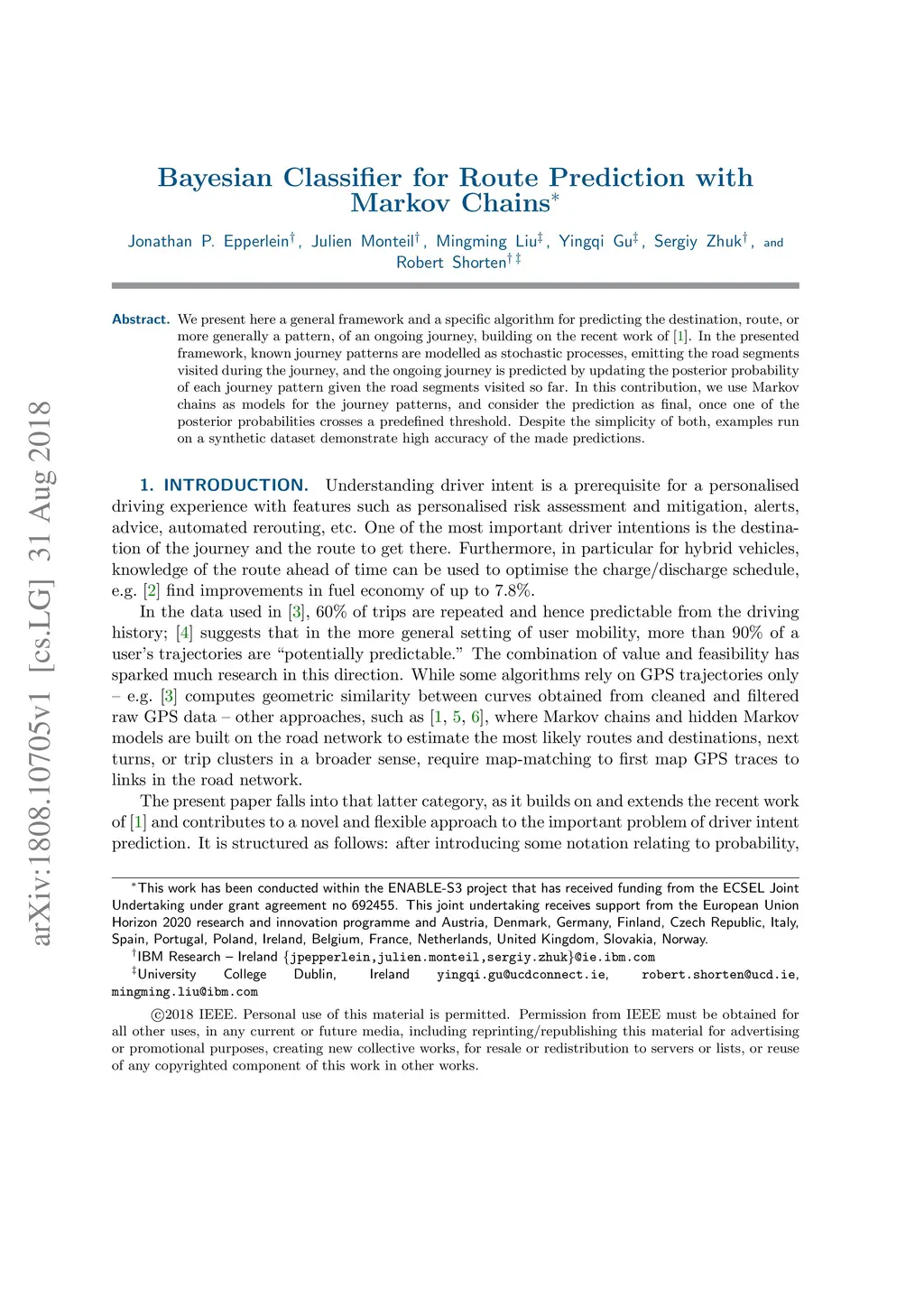 We present here a general framework and a specific algorithm for predicting the destination, route, or more generally a pattern, of an ongoing journey, building on the recent work of [Y. Lassoued, J. Monteil, Y. Gu, G. Russo, R. Shorten, and M. Mevissen, "Hidden Markov model for route and destination prediction," in IEEE International Conference on Intelligent Transportation Systems, 2017]. In the presented framework, known journey patterns are modelled as stochastic processes, emitting the road segments visited during the journey, and the ongoing journey is predicted by updating the posterior probability of each journey pattern given the road segments visited so far. In this contribution, we use Markov chains as models for the journey patterns, and consider the prediction as final, once one of the posterior probabilities crosses a predefined threshold. Despite the simplicity of both, examples run on a synthetic dataset demonstrate high accuracy of the made predictions.