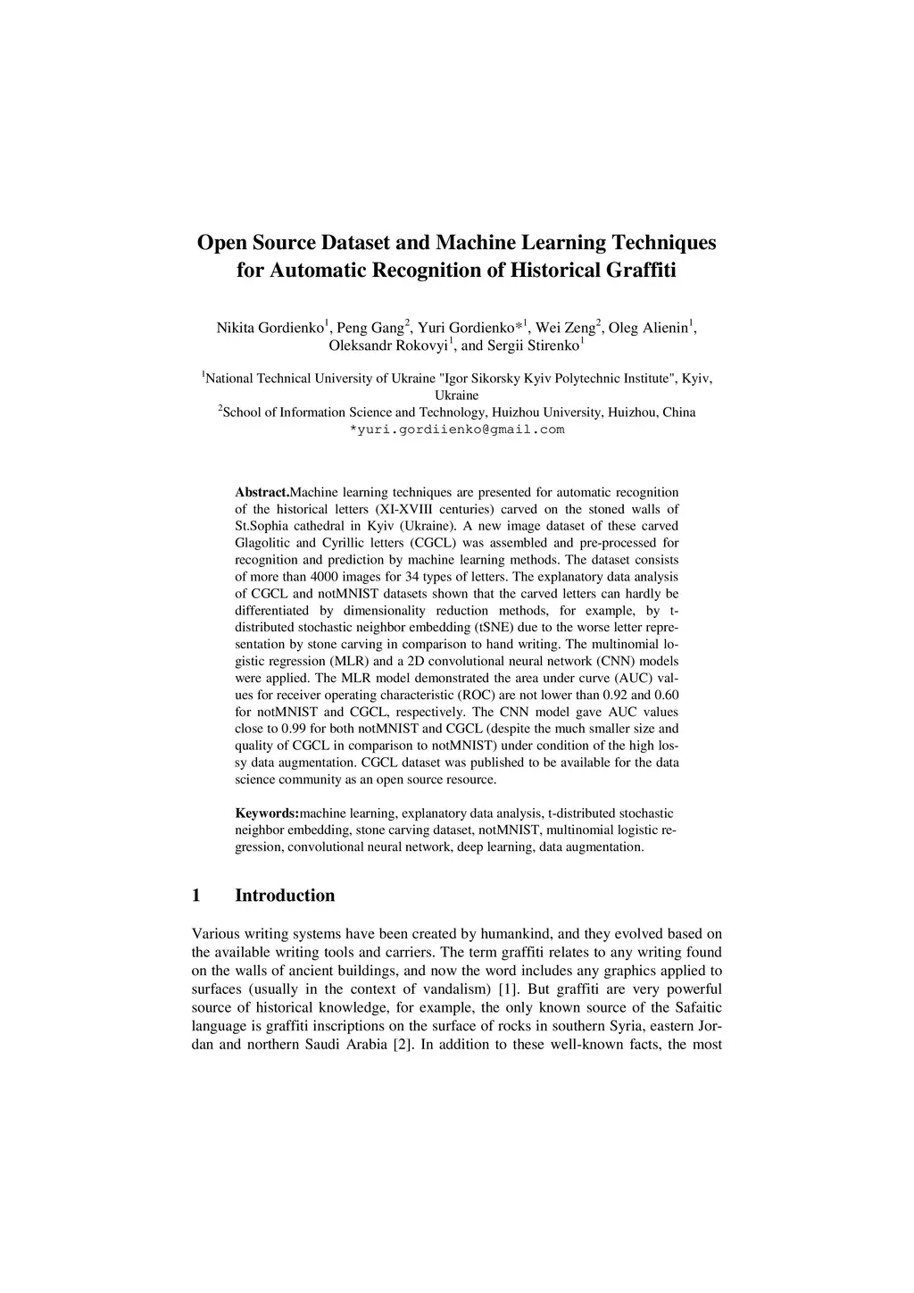 Machine learning techniques are presented for automatic recognition of the historical letters (XI-XVIII centuries) carved on the stoned walls of St.Sophia cathedral in Kyiv (Ukraine). A new image dataset of these carved Glagolitic and Cyrillic letters (CGCL) was assembled and pre-processed for recognition and prediction by machine learning methods. The dataset consists of more than 4000 images for 34 types of letters. The explanatory data analysis of CGCL and notMNIST datasets shown that the carved letters can hardly be differentiated by dimensionality reduction methods, for example, by t-distributed stochastic neighbor embedding (tSNE) due to the worse letter representation by stone carving in comparison to hand writing. The multinomial logistic regression (MLR) and a 2D convolutional neural network (CNN) models were applied. The MLR model demonstrated the area under curve (AUC) values for receiver operating characteristic (ROC) are not lower than 0.92 and 0.60 for notMNIST and CGCL, respectively. The CNN model gave AUC values close to 0.99 for both notMNIST and CGCL (despite the much smaller size and quality of CGCL in comparison to notMNIST) under condition of the high lossy data augmentation. CGCL dataset was published to be available for the data science community as an open source resource.