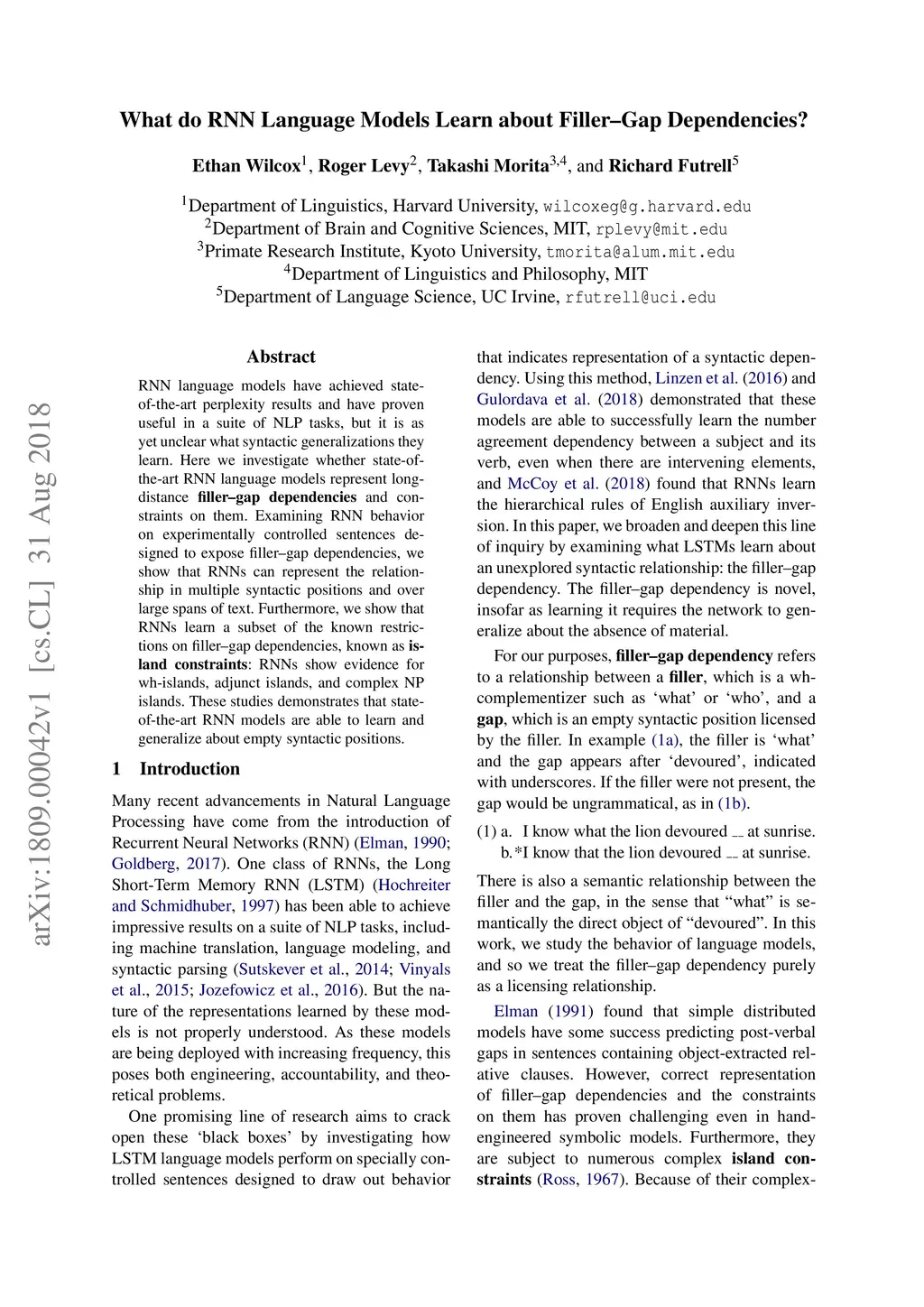 RNN language models have achieved state-of-the-art perplexity results and have proven useful in a suite of NLP tasks, but it is as yet unclear what syntactic generalizations they learn. Here we investigate whether state-of-the-art RNN language models represent long-distance filler-gap dependencies and constraints on them. Examining RNN behavior on experimentally controlled sentences designed to expose filler-gap dependencies, we show that RNNs can represent the relationship in multiple syntactic positions and over large spans of text. Furthermore, we show that RNNs learn a subset of the known restrictions on filler-gap dependencies, known as island constraints: RNNs show evidence for wh-islands, adjunct islands, and complex NP islands. These studies demonstrates that state-of-the-art RNN models are able to learn and generalize about empty syntactic positions.