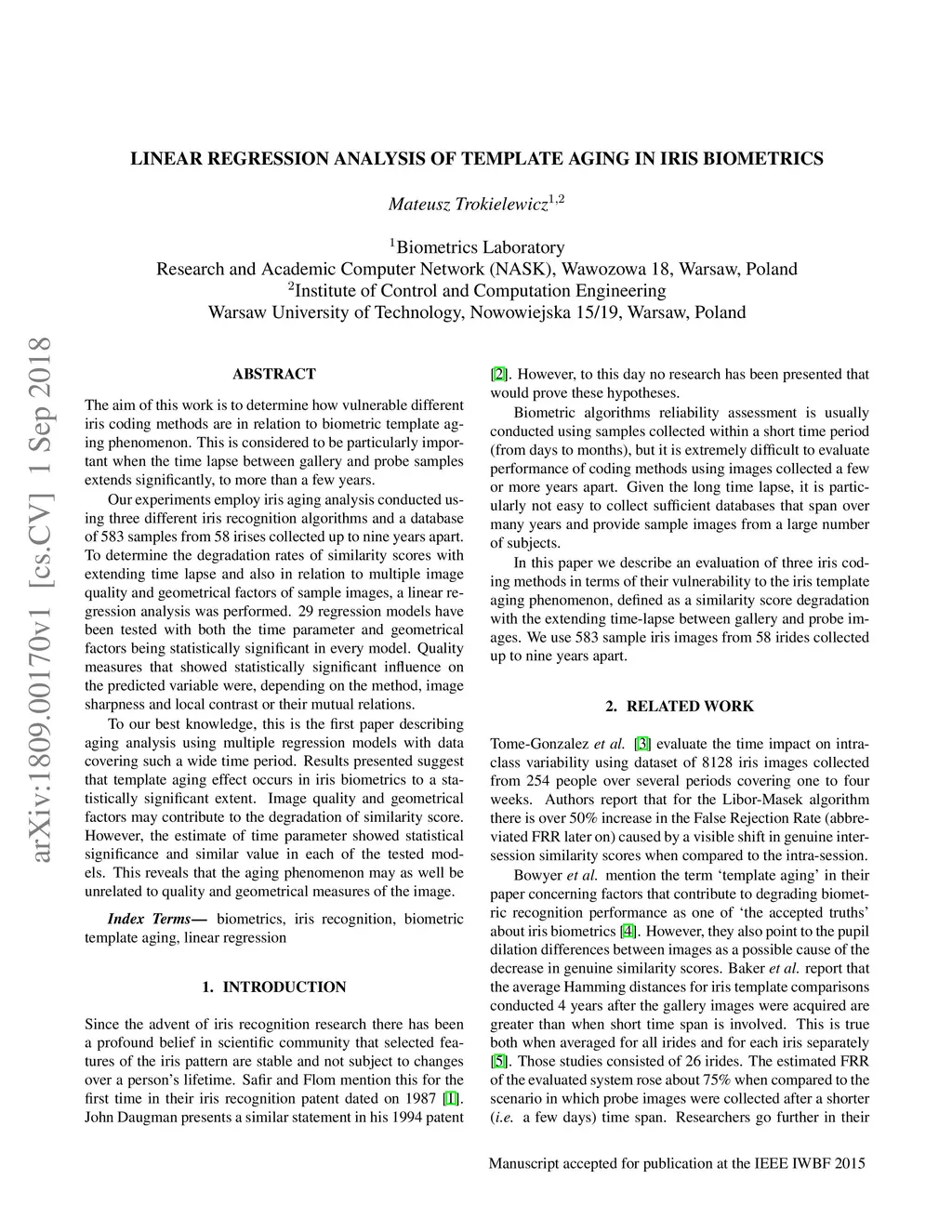 The aim of this work is to determine how vulnerable different iris coding methods are in relation to biometric template aging phenomenon. This is considered to be particularly important when the time lapse between gallery and probe samples extends significantly, to more than a few years. Our experiments employ iris aging analysis conducted using three different iris recognition algorithms and a database of 583 samples from 58 irises collected up to nine years apart. To determine the degradation rates of similarity scores with extending time lapse and also in relation to multiple image quality and geometrical factors of sample images, a linear regression analysis was performed. 29 regression models have been tested with both the time parameter and geometrical factors being statistically significant in every model. Quality measures that showed statistically significant influence on the predicted variable were, depending on the method, image sharpness and local contrast or their mutual relations. To our best knowledge, this is the first paper describing aging analysis using multiple regression models with data covering such a wide time period. Results presented suggest that template aging effect occurs in iris biometrics to a statistically significant extent. Image quality and geometrical factors may contribute to the degradation of similarity score. However, the estimate of time parameter showed statistical significance and similar value in each of the tested models. This reveals that the aging phenomenon may as well be unrelated to quality and geometrical measures of the image.