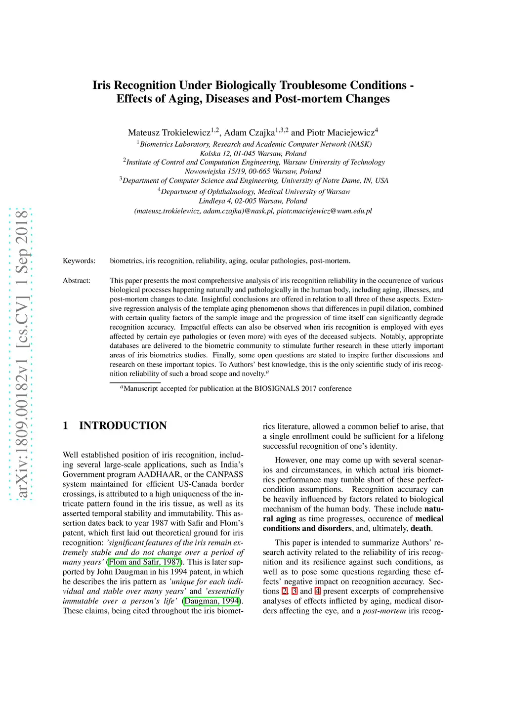 Iris Recognition Under Biologically Troublesome Conditions - Effects of