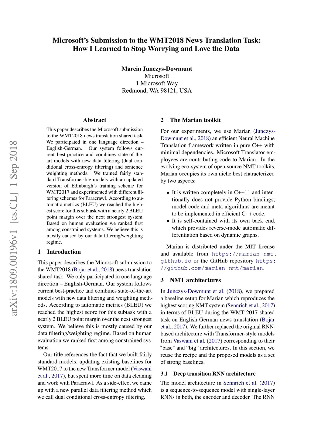 This paper describes the Microsoft submission to the WMT2018 news translation shared task. We participated in one language direction -- English-German. Our system follows current best-practice and combines state-of-the-art models with new data filtering (dual conditional cross-entropy filtering) and sentence weighting methods. We trained fairly standard Transformer-big models with an updated version of Edinburgh's training scheme for WMT2017 and experimented with different filtering schemes for Paracrawl. According to automatic metrics (BLEU) we reached the highest score for this subtask with a nearly 2 BLEU point margin over the next strongest system. Based on human evaluation we ranked first among constrained systems. We believe this is mostly caused by our data filtering/weighting regime.