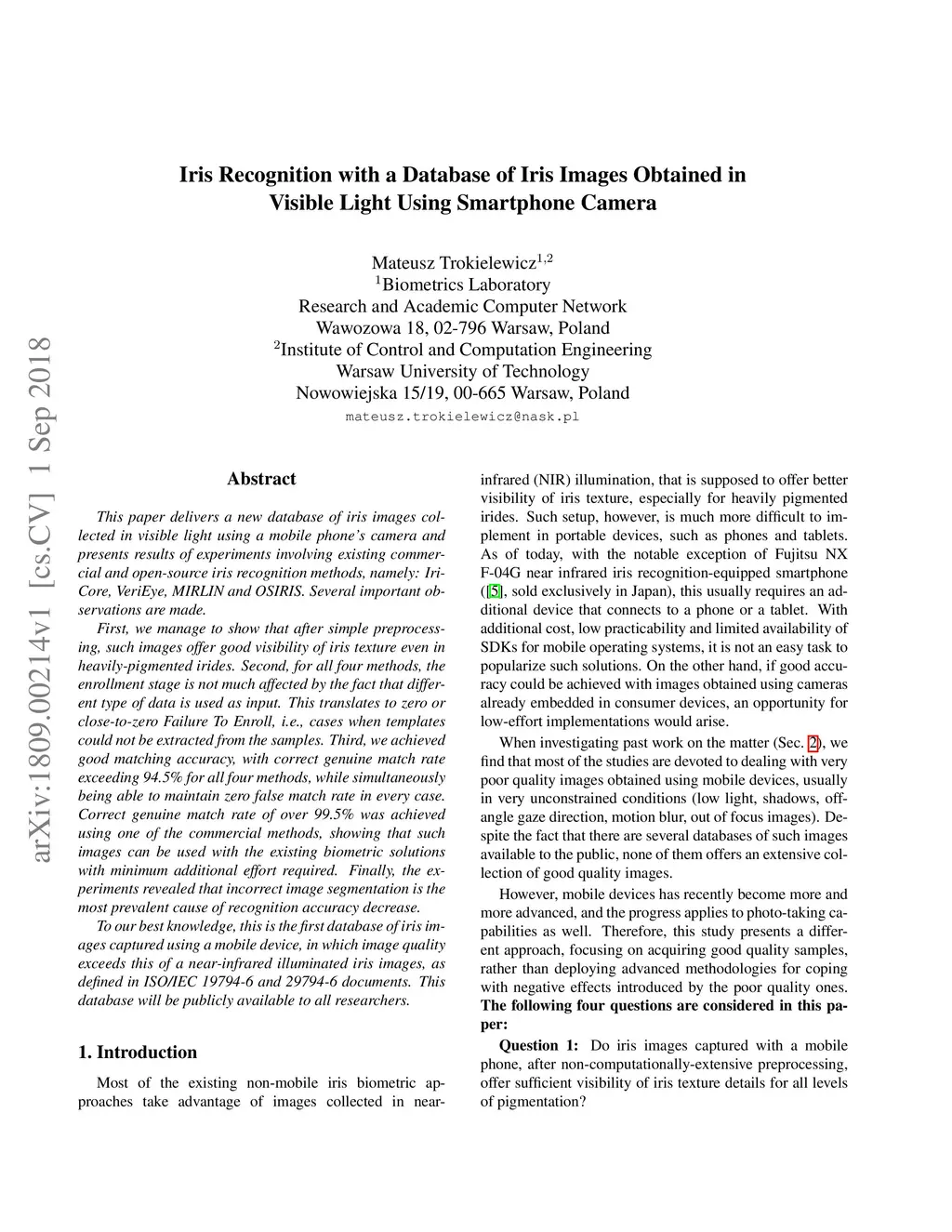 Iris Recognition with a Database of Iris Images Obtained in Visible