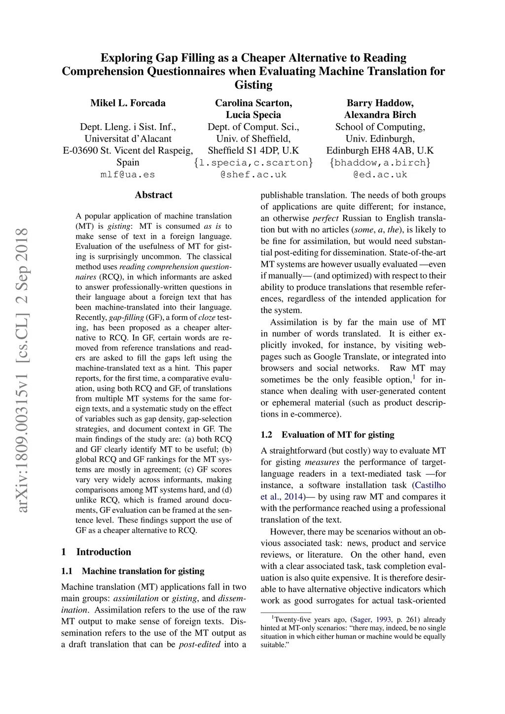 A popular application of machine translation (MT) is gisting: MT is consumed as is to make sense of text in a foreign language. Evaluation of the usefulness of MT for gisting is surprisingly uncommon. The classical method uses reading comprehension questionnaires (RCQ), in which informants are asked to answer professionally-written questions in their language about a foreign text that has been machine-translated into their language. Recently, gap-filling (GF), a form of cloze testing, has been proposed as a cheaper alternative to RCQ. In GF, certain words are removed from reference translations and readers are asked to fill the gaps left using the machine-translated text as a hint. This paper reports, for thefirst time, a comparative evaluation, using both RCQ and GF, of translations from multiple MT systems for the same foreign texts, and a systematic study on the effect of variables such as gap density, gap-selection strategies, and document context in GF. The main findings of the study are: (a) both RCQ and GF clearly identify MT to be useful, (b) global RCQ and GF rankings for the MT systems are mostly in agreement, (c) GF scores vary very widely across informants, making comparisons among MT systems hard, and (d) unlike RCQ, which is framed around documents, GF evaluation can be framed at the sentence level. These findings support the use of GF as a cheaper alternative to RCQ.