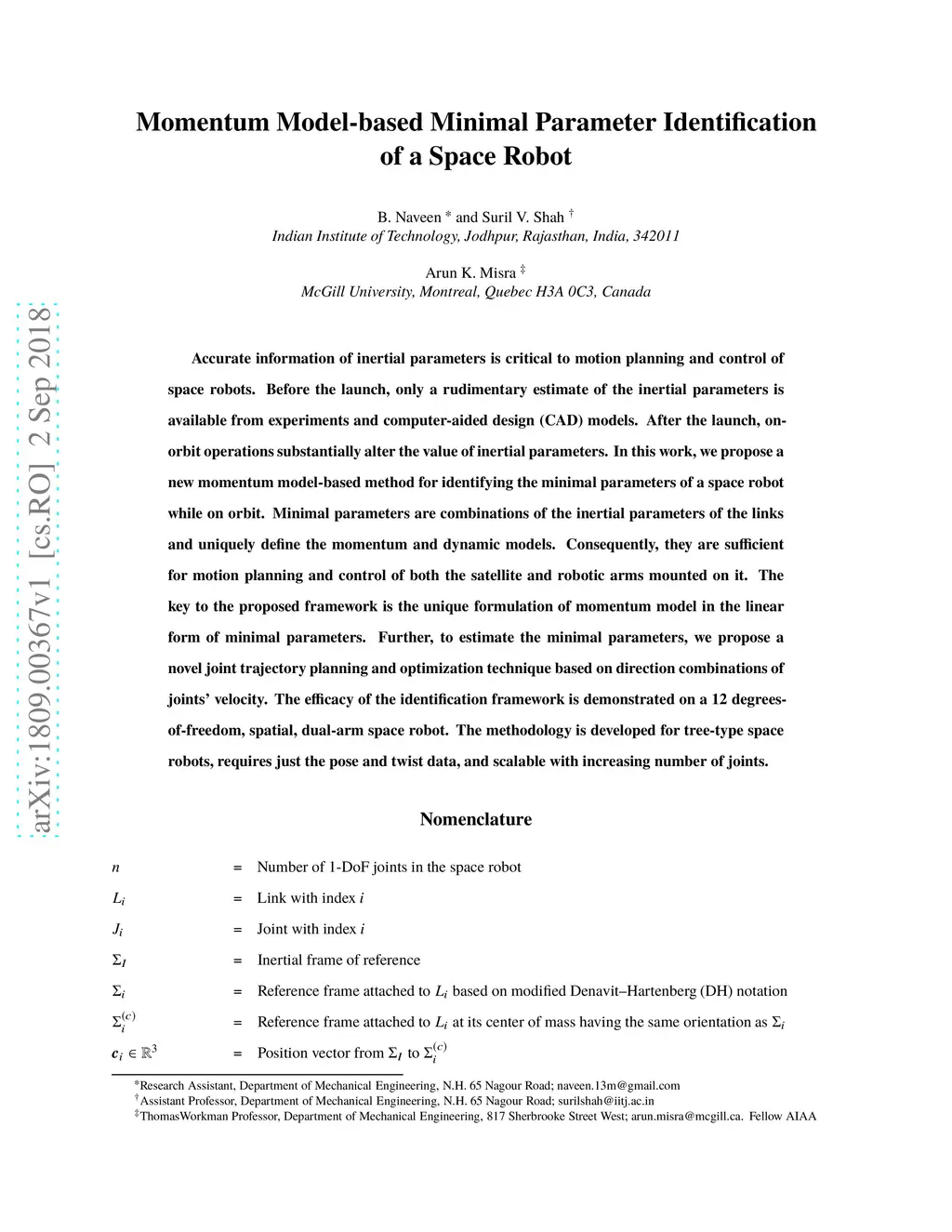 Momentum Model-based Minimal Parameter Identification of a Space Robot
