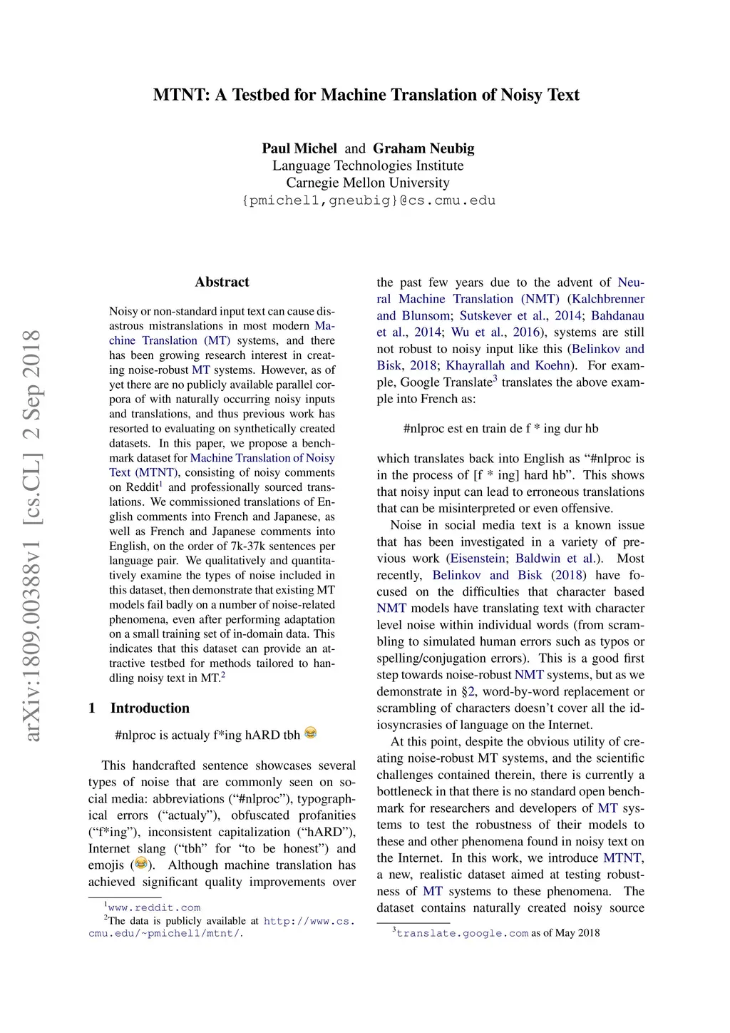 MTNT: A Testbed for Machine Translation of Noisy Text