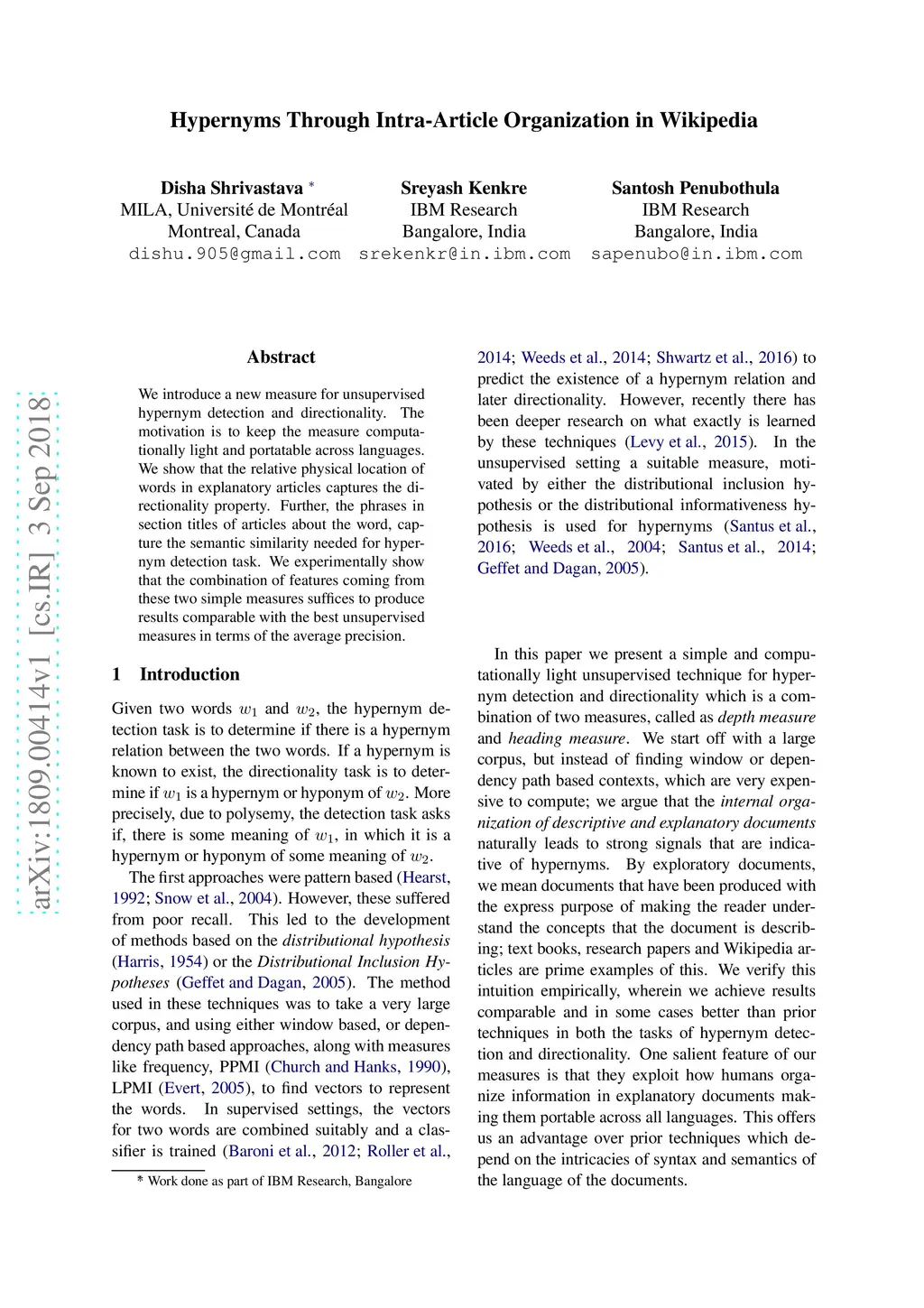 We introduce a new measure for unsupervised hypernym detection and directionality. The motivation is to keep the measure computationally light and portatable across languages. We show that the relative physical location of words in explanatory articles captures the directionality property. Further, the phrases in section titles of articles about the word, capture the semantic similarity needed for hypernym detection task. We experimentally show that the combination of features coming from these two simple measures suffices to produce results comparable with the best unsupervised measures in terms of the average precision.