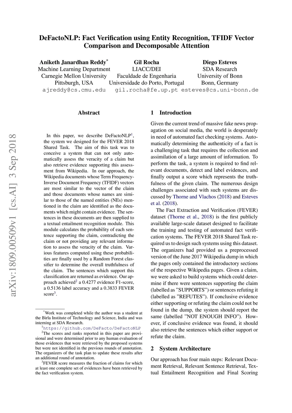 DeFactoNLP: Fact Verification using Entity Recognition, TFIDF Vector