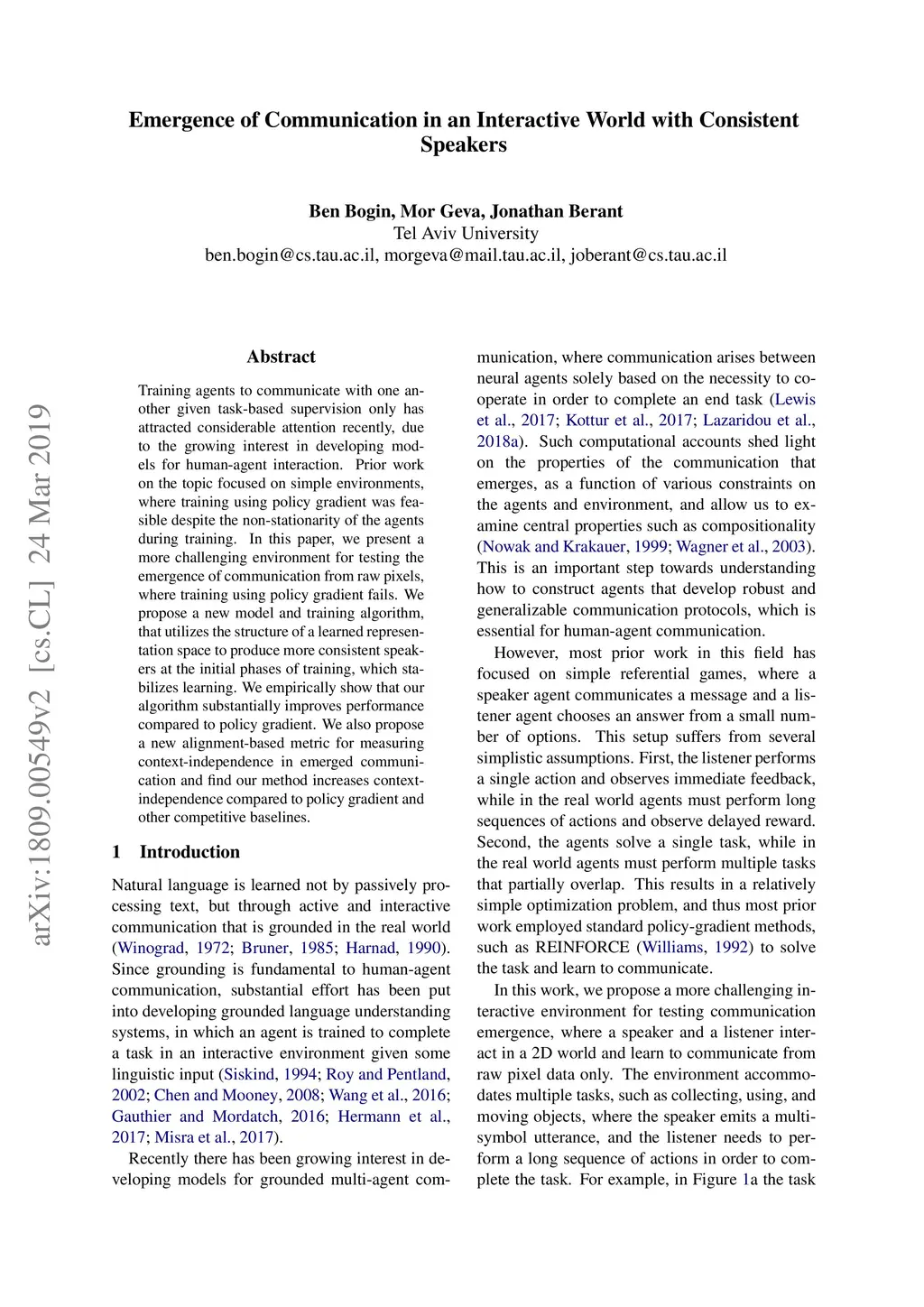 Training agents to communicate with one another given task-based supervision only has attracted considerable attention recently, due to the growing interest in developing models for human-agent interaction. Prior work on the topic focused on simple environments, where training using policy gradient was feasible despite the non-stationarity of the agents during training. In this paper, we present a more challenging environment for testing the emergence of communication from raw pixels, where training using policy gradient fails. We propose a new model and training algorithm, that utilizes the structure of a learned representation space to produce more consistent speakers at the initial phases of training, which stabilizes learning. We empirically show that our algorithm substantially improves performance compared to policy gradient. We also propose a new alignment-based metric for measuring context-independence in emerged communication and find our method increases context-independence compared to policy gradient and other competitive baselines.