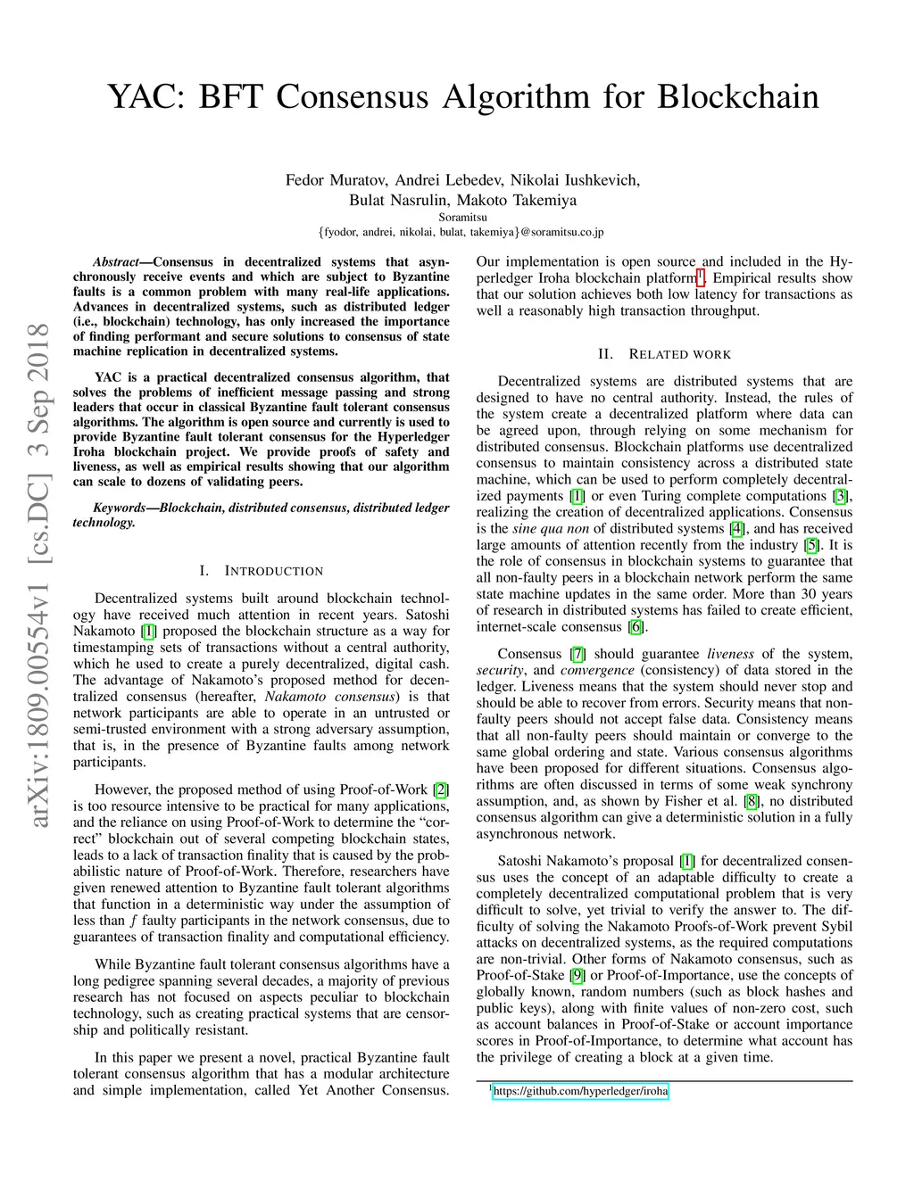 Consensus in decentralized systems that asynchronously receive events and which are subject to Byzantine faults is a common problem with many real-life applications. Advances in decentralized systems, such as distributed ledger (i.e., blockchain) technology, has only increased the importance of finding performant and secure solutions to consensus of state machine replication in decentralized systems. YAC is a practical decentralized consensus algorithm, that solves the problems of inefficient message passing and strong leaders that occur in classical Byzantine fault tolerant consensus algorithms. The algorithm is open source and currently is used to provide Byzantine fault tolerant consensus for the Hyperledger Iroha blockchain project. We provide proofs of safety and liveness, as well as empirical results showing that our algorithm can scale to dozens of validating peers.