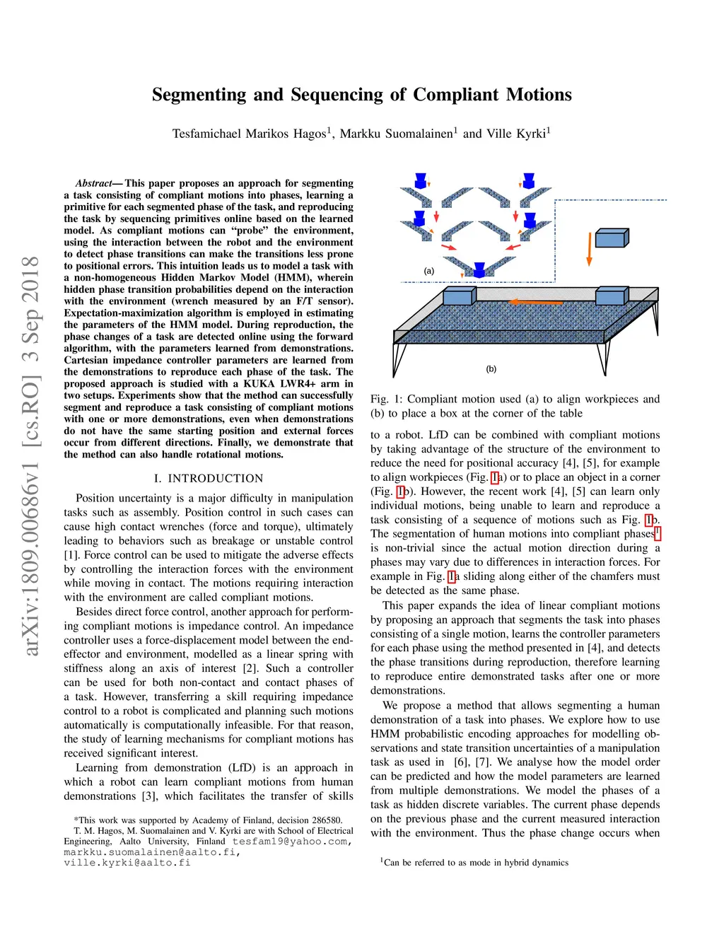This paper proposes an approach for segmenting a task consisting of compliant motions into phases, learning a primitive for each segmented phase of the task, and reproducing the task by sequencing primitives online based on the learned model. As compliant motions can "probe" the environment, using the interaction between the robot and the environment to detect phase transitions can make the transitions less prone to positional errors. This intuition leads us to model a task with a non-homogeneous Hidden Markov Model (HMM), wherein hidden phase transition probabilities depend on the interaction with the environment (wrench measured by an F/T sensor). Expectation-maximization algorithm is employed in estimating the parameters of the HMM model. During reproduction, the phase changes of a task are detected online using the forward algorithm, with the parameters learned from demonstrations. Cartesian impedance controller parameters are learned from the demonstrations to reproduce each phase of the task. The proposed approach is studied with a KUKA LWR4+ arm in two setups. Experiments show that the method can successfully segment and reproduce a task consisting of compliant motions with one or more demonstrations, even when demonstrations do not have the same starting position and external forces occur from different directions. Finally, we demonstrate that the method can also handle rotational motions.
