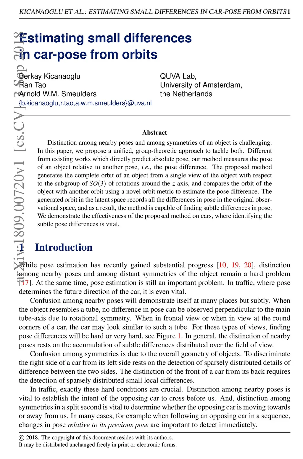 Distinction among nearby poses and among symmetries of an object is challenging. In this paper, we propose a unified, group-theoretic approach to tackle both. Different from existing works which directly predict absolute pose, our method measures the pose of an object relative to another pose, i.e., the pose difference. The proposed method generates the complete orbit of an object from a single view of the object with respect to the subgroup of SO(3) of rotations around the z-axis, and compares the orbit of the object with another orbit using a novel orbit metric to estimate the pose difference. The generated orbit in the latent space records all the differences in pose in the original observational space, and as a result, the method is capable of finding subtle differences in pose. We demonstrate the effectiveness of the proposed method on cars, where identifying the subtle pose differences is vital.