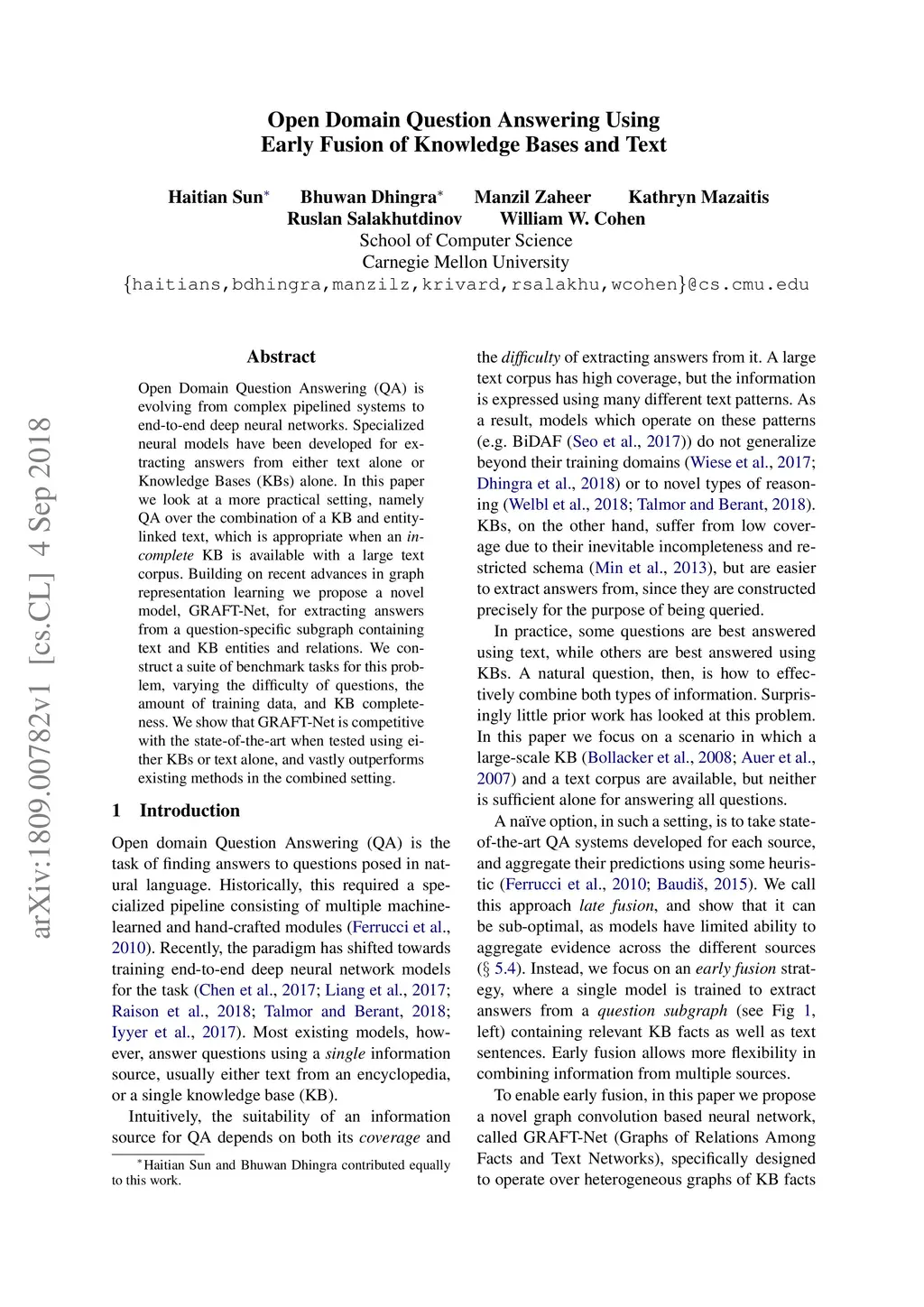 Open Domain Question Answering Using Early Fusion of Knowledge Bases and