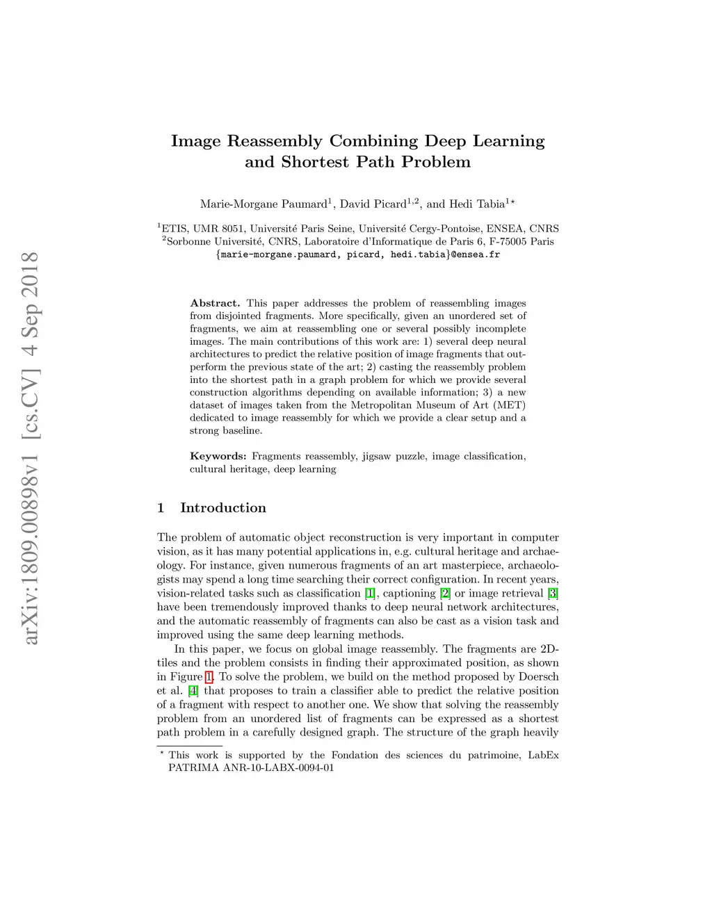 This paper addresses the problem of reassembling images from disjointed fragments. More specifically, given an unordered set of fragments, we aim at reassembling one or several possibly incomplete images. The main contributions of this work are: 1) several deep neural architectures to predict the relative position of image fragments that outperform the previous state of the art; 2) casting the reassembly problem into the shortest path in a graph problem for which we provide several construction algorithms depending on available information; 3) a new dataset of images taken from the Metropolitan Museum of Art (MET) dedicated to image reassembly for which we provide a clear setup and a strong baseline.