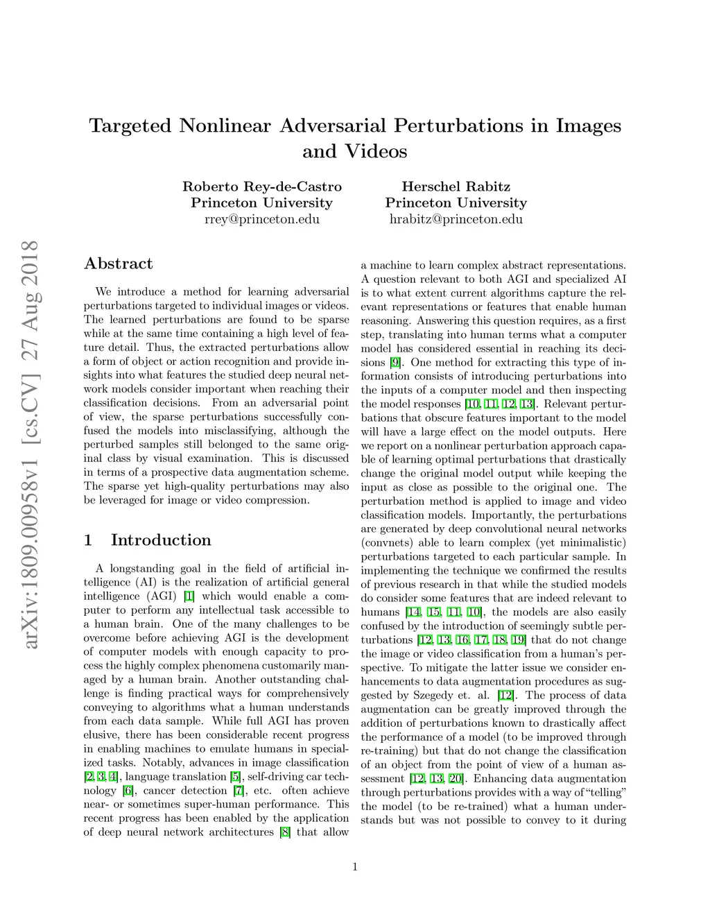 We introduce a method for learning adversarial perturbations targeted to individual images or videos. The learned perturbations are found to be sparse while at the same time containing a high level of feature detail. Thus, the extracted perturbations allow a form of object or action recognition and provide insights into what features the studied deep neural network models consider important when reaching their classification decisions. From an adversarial point of view, the sparse perturbations successfully confused the models into misclassifying, although the perturbed samples still belonged to the same original class by visual examination. This is discussed in terms of a prospective data augmentation scheme. The sparse yet high-quality perturbations may also be leveraged for image or video compression.