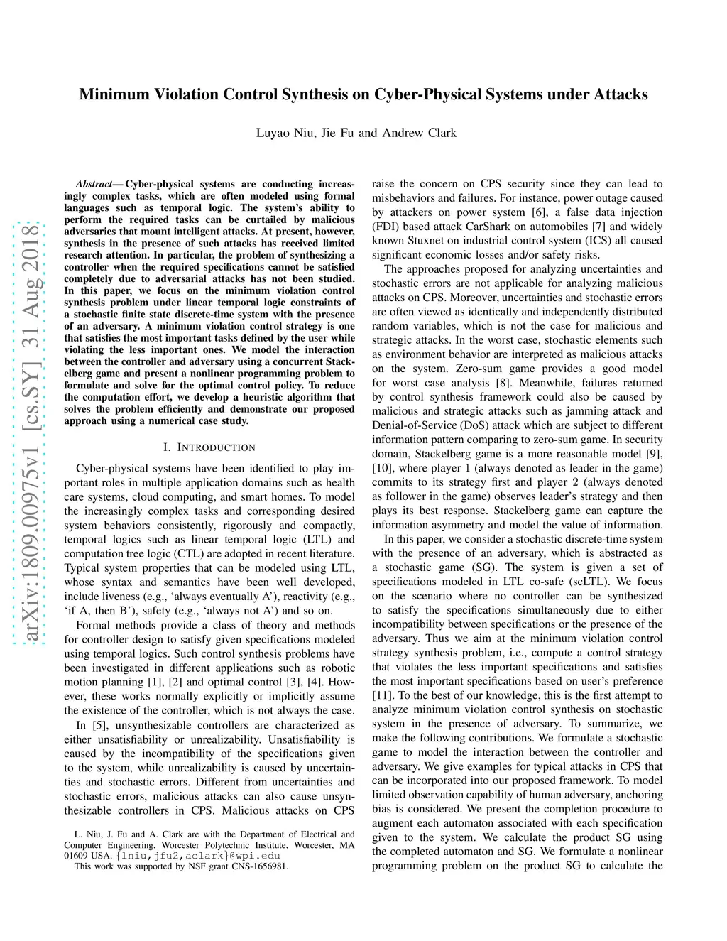 Cyber-physical systems are conducting increasingly complex tasks, which are often modeled using formal languages such as temporal logic. The system's ability to perform the required tasks can be curtailed by malicious adversaries that mount intelligent attacks. At present, however, synthesis in the presence of such attacks has received limited research attention. In particular, the problem of synthesizing a controller when the required specifications cannot be satisfied completely due to adversarial attacks has not been studied. In this paper, we focus on the minimum violation control synthesis problem under linear temporal logic constraints of a stochastic finite state discrete-time system with the presence of an adversary. A minimum violation control strategy is one that satisfies the most important tasks defined by the user while violating the less important ones. We model the interaction between the controller and adversary using a concurrent Stackelberg game and present a nonlinear programming problem to formulate and solve for the optimal control policy. To reduce the computation effort, we develop a heuristic algorithm that solves the problem efficiently and demonstrate our proposed approach using a numerical case study.