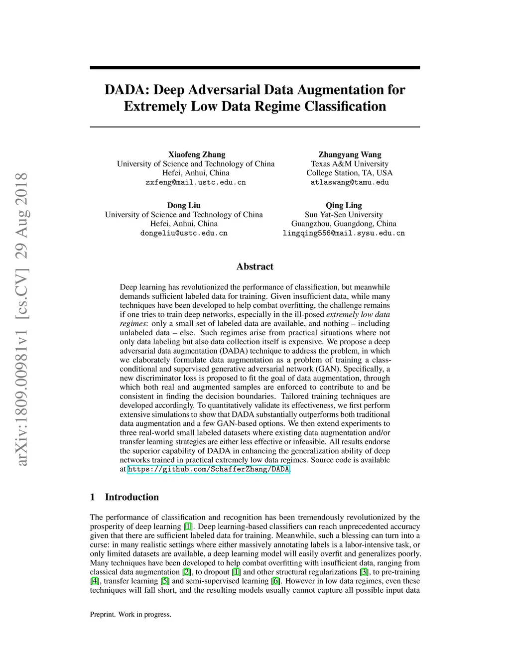DADA: Deep Adversarial Data Augmentation for Extremely Low Data Regime