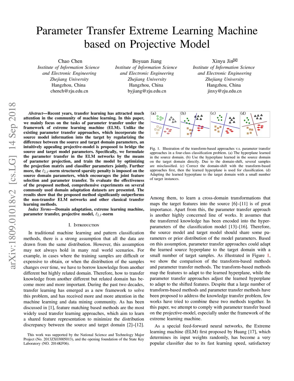 Recent years, transfer learning has attracted much attention in the community of machine learning. In this paper, we mainly focus on the tasks of parameter transfer under the framework of extreme learning machine (ELM). Unlike the existing parameter transfer approaches, which incorporate the source model information into the target by regularizing the di erence between the source and target domain parameters, an intuitively appealing projective-model is proposed to bridge the source and target model parameters. Specifically, we formulate the parameter transfer in the ELM networks by the means of parameter projection, and train the model by optimizing the projection matrix and classifier parameters jointly. Further more, the `L2,1-norm structured sparsity penalty is imposed on the source domain parameters, which encourages the joint feature selection and parameter transfer. To evaluate the e ectiveness of the proposed method, comprehensive experiments on several commonly used domain adaptation datasets are presented. The results show that the proposed method significantly outperforms the non-transfer ELM networks and other classical transfer learning methods.