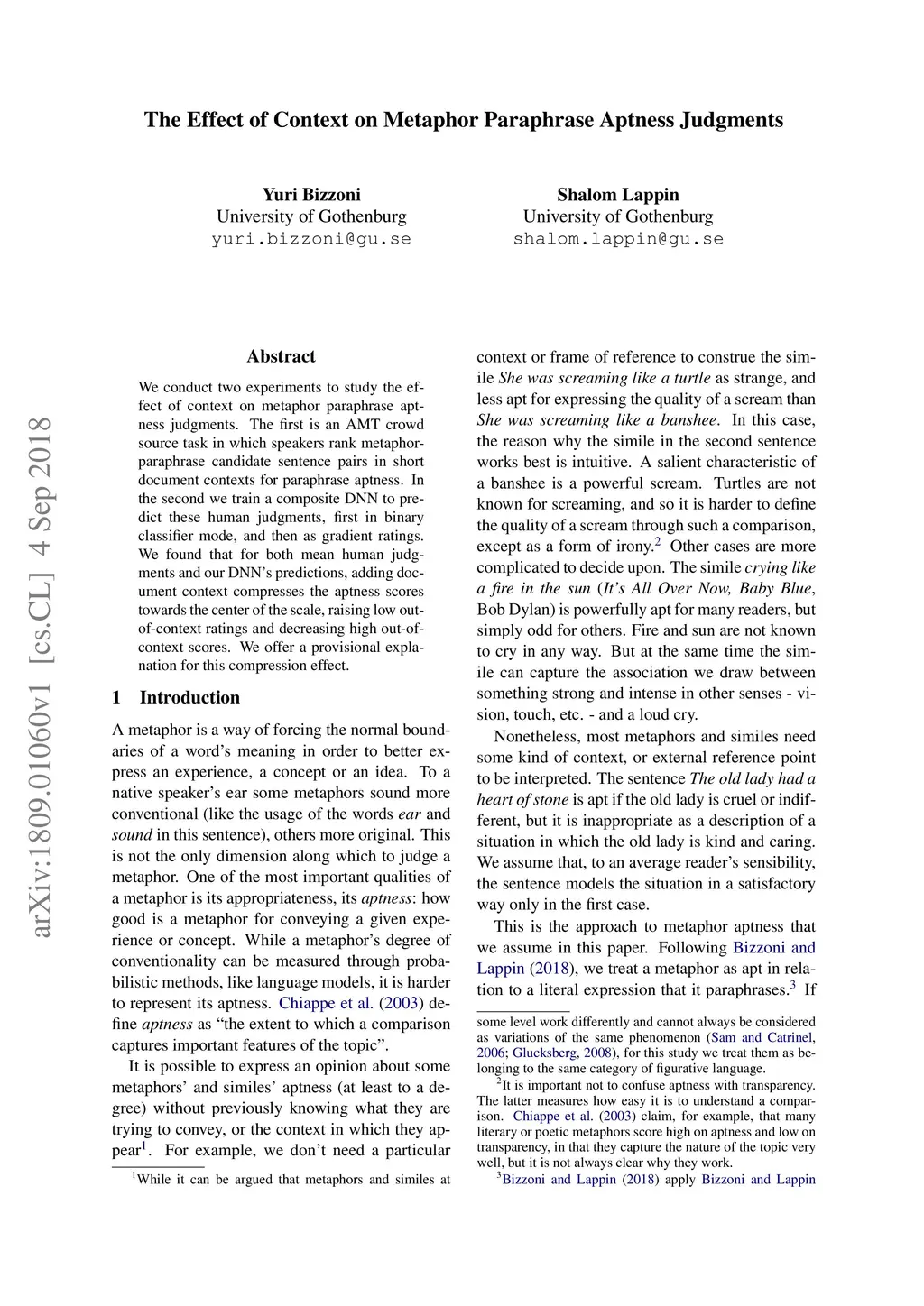We conduct two experiments to study the effect of context on metaphor paraphrase aptness judgments. The first is an AMT crowd source task in which speakers rank metaphor paraphrase candidate sentence pairs in short document contexts for paraphrase aptness. In the second we train a composite DNN to predict these human judgments, first in binary classifier mode, and then as gradient ratings. We found that for both mean human judgments and our DNN's predictions, adding document context compresses the aptness scores towards the center of the scale, raising low out of context ratings and decreasing high out of context scores. We offer a provisional explanation for this compression effect.