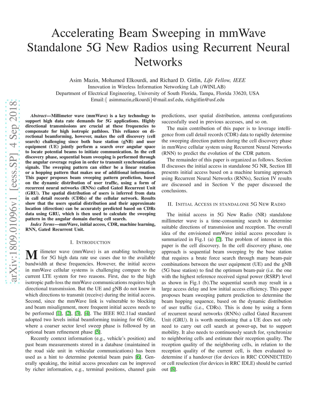 Millimeter wave (mmWave) is a key technology to support high data rate demands for 5G applications. Highly directional transmissions are crucial at these frequencies to compensate for high isotropic pathloss. This reliance on di- rectional beamforming, however, makes the cell discovery (cell search) challenging since both base station (gNB) and user equipment (UE) jointly perform a search over angular space to locate potential beams to initiate communication. In the cell discovery phase, sequential beam sweeping is performed through the angular coverage region in order to transmit synchronization signals. The sweeping pattern can either be a linear rotation or a hopping pattern that makes use of additional information. This paper proposes beam sweeping pattern prediction, based on the dynamic distribution of user traffic, using a form of recurrent neural networks (RNNs) called Gated Recurrent Unit (GRU). The spatial distribution of users is inferred from data in call detail records (CDRs) of the cellular network. Results show that the users spatial distribution and their approximate location (direction) can be accurately predicted based on CDRs data using GRU, which is then used to calculate the sweeping pattern in the angular domain during cell search.