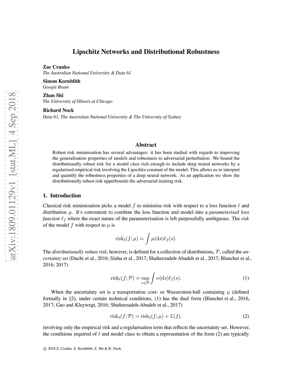 Robust risk minimisation has several advantages: it has been studied with regards to improving the generalisation properties of models and robustness to adversarial perturbation. We bound the distributionally robust risk for a model class rich enough to include deep neural networks by a regularised empirical risk involving the Lipschitz constant of the model. This allows us to interpretand quantify the robustness properties of a deep neural network. As an application we show the distributionally robust risk upperbounds the adversarial training risk.