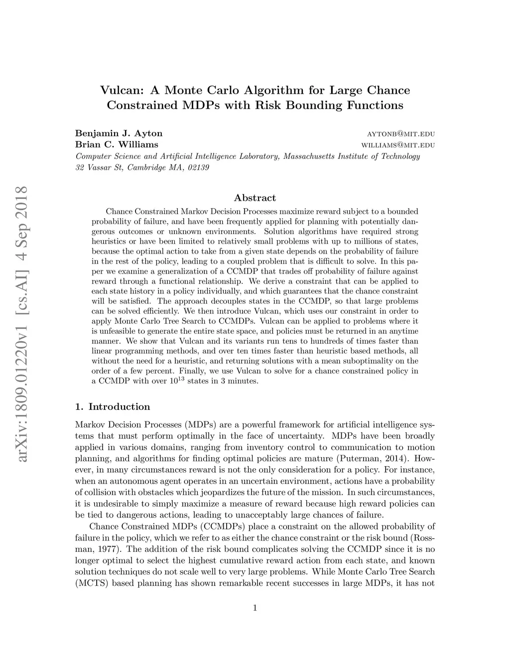 Chance Constrained Markov Decision Processes maximize reward subject to a bounded probability of failure, and have been frequently applied for planning with potentially dangerous outcomes or unknown environments. Solution algorithms have required strong heuristics or have been limited to relatively small problems with up to millions of states, because the optimal action to take from a given state depends on the probability of failure in the rest of the policy, leading to a coupled problem that is difficult to solve. In this paper we examine a generalization of a CCMDP that trades off probability of failure against reward through a functional relationship. We derive a constraint that can be applied to each state history in a policy individually, and which guarantees that the chance constraint will be satisfied. The approach decouples states in the CCMDP, so that large problems can be solved efficiently. We then introduce Vulcan, which uses our constraint in order to apply Monte Carlo Tree Search to CCMDPs. Vulcan can be applied to problems where it is unfeasible to generate the entire state space, and policies must be returned in an anytime manner. We show that Vulcan and its variants run tens to hundreds of times faster than linear programming methods, and over ten times faster than heuristic based methods, all without the need for a heuristic, and returning solutions with a mean suboptimality on the order of a few percent. Finally, we use Vulcan to solve for a chance constrained policy in a CCMDP with over states in 3 minutes.