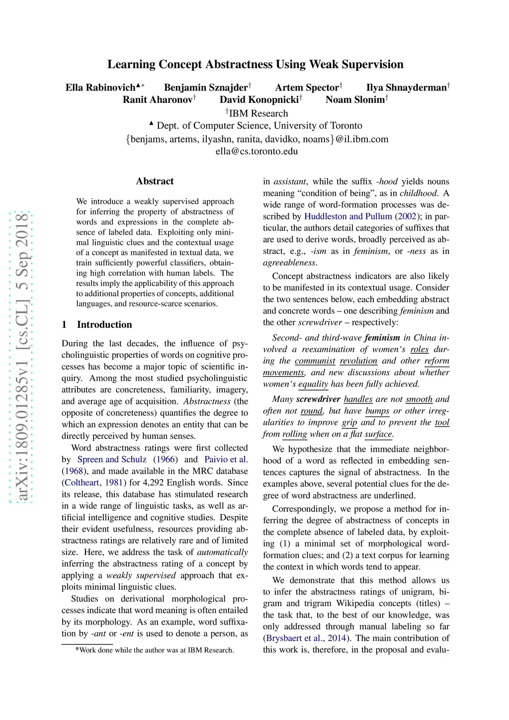 We introduce a weakly supervised approach for inferring the property of abstractness of words and expressions in the complete absence of labeled data. Exploiting only minimal linguistic clues and the contextual usage of a concept as manifested in textual data, we train sufficiently powerful classifiers, obtaining high correlation with human labels. The results imply the applicability of this approach to additional properties of concepts, additional languages, and resource-scarce scenarios.