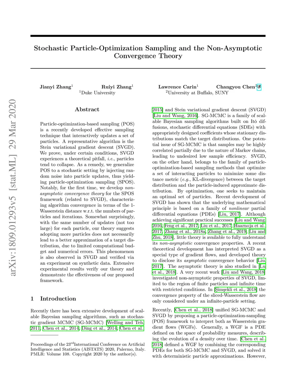 Particle-optimization-based sampling (POS) is a recently developed effective sampling technique that interactively updates a set of particles. A representative algorithm is the Stein variational gradient descent (SVGD). We prove, under certain conditions, SVGD experiences a theoretical pitfall, {\it i.e.}, particles tend to collapse. As a remedy, we generalize POS to a stochastic setting by injecting random noise into particle updates, thus yielding particle-optimization sampling (SPOS). Notably, for the first time, we develop {\em non-asymptotic convergence theory} for the SPOS framework (related to SVGD), characterizing algorithm convergence in terms of the 1-Wasserstein distance w.r.t.\! the numbers of particles and iterations. Somewhat surprisingly, with the same number of updates (not too large) for each particle, our theory suggests adopting more particles does not necessarily lead to a better approximation of a target distribution, due to limited computational budget and numerical errors. This phenomenon is also observed in SVGD and verified via an experiment on synthetic data. Extensive experimental results verify our theory and demonstrate the effectiveness of our proposed framework.
