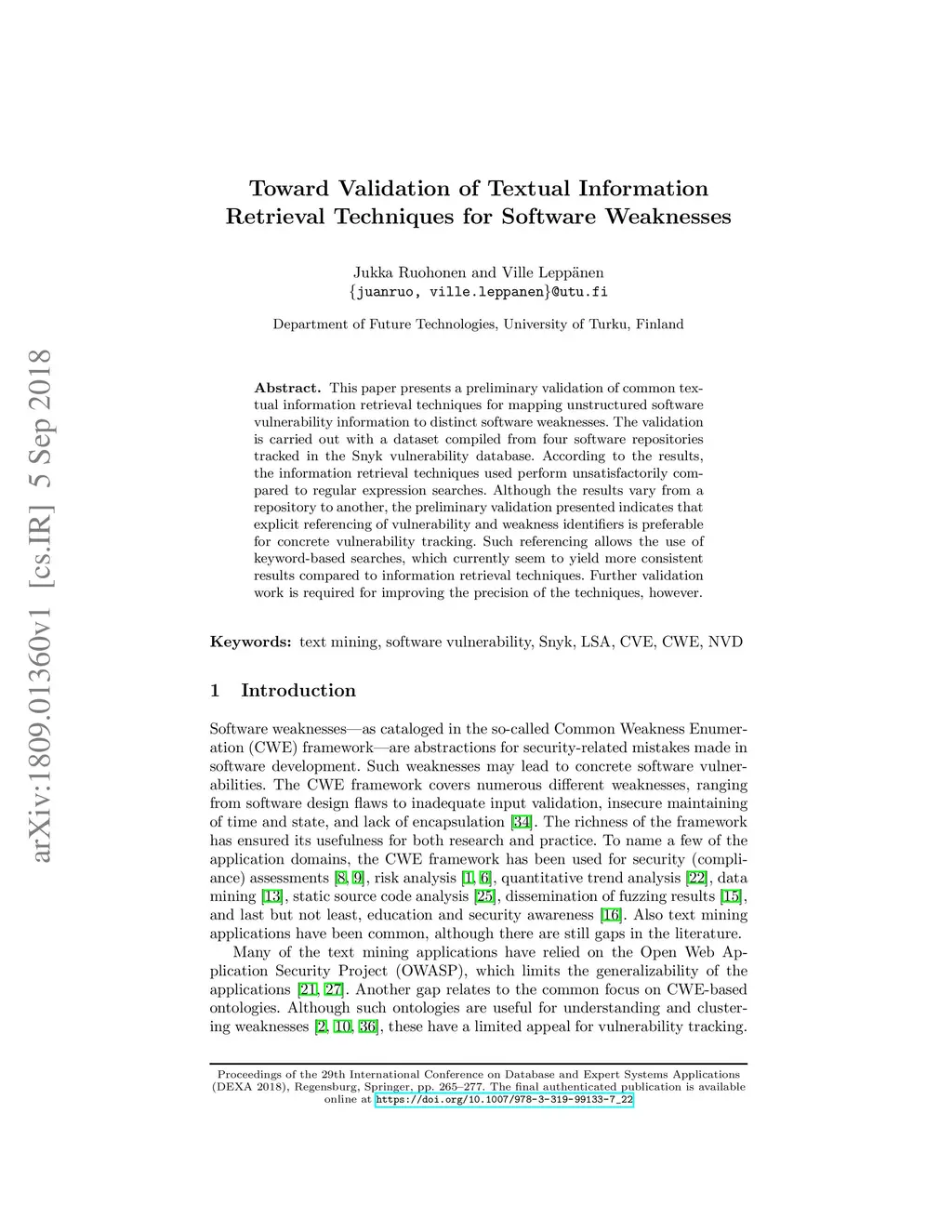 This paper presents a preliminary validation of common textual information retrieval techniques for mapping unstructured software vulnerability information to distinct software weaknesses. The validation is carried out with a dataset compiled from four software repositories tracked in the Snyk vulnerability database. According to the results, the information retrieval techniques used perform unsatisfactorily compared to regular expression searches. Although the results vary from a repository to another, the preliminary validation presented indicates that explicit referencing of vulnerability and weakness identifiers is preferable for concrete vulnerability tracking. Such referencing allows the use of keyword-based searches, which currently seem to yield more consistent results compared to information retrieval techniques. Further validation work is required for improving the precision of the techniques, however.
